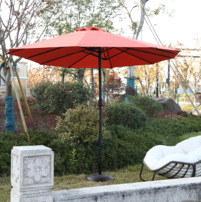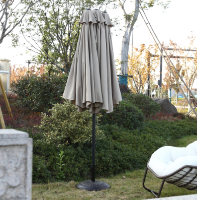 This market umbrella has a crank mechanism, you can easily open and close the umbrella in a few seconds by rotating the crank handle. No base are included and lightweight.