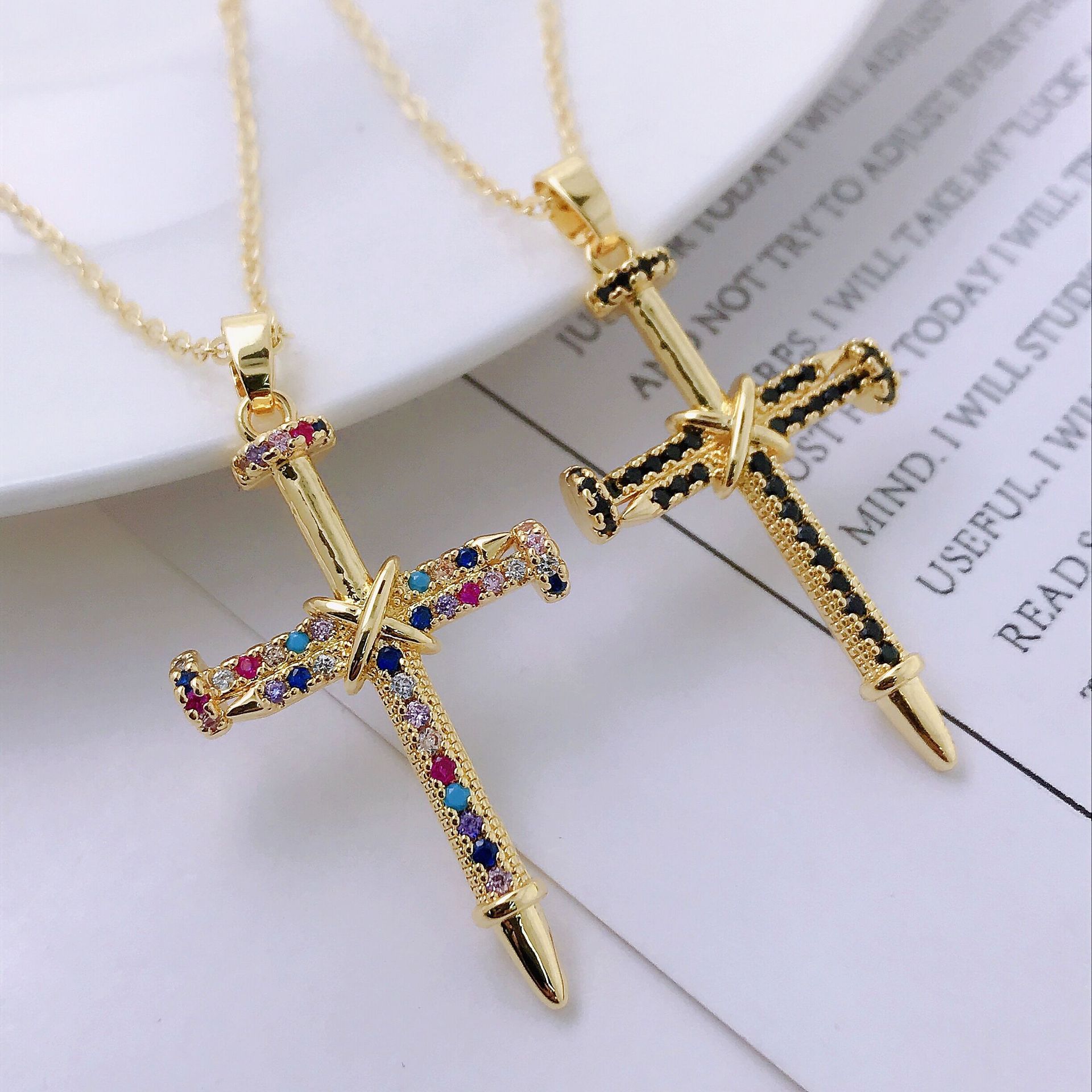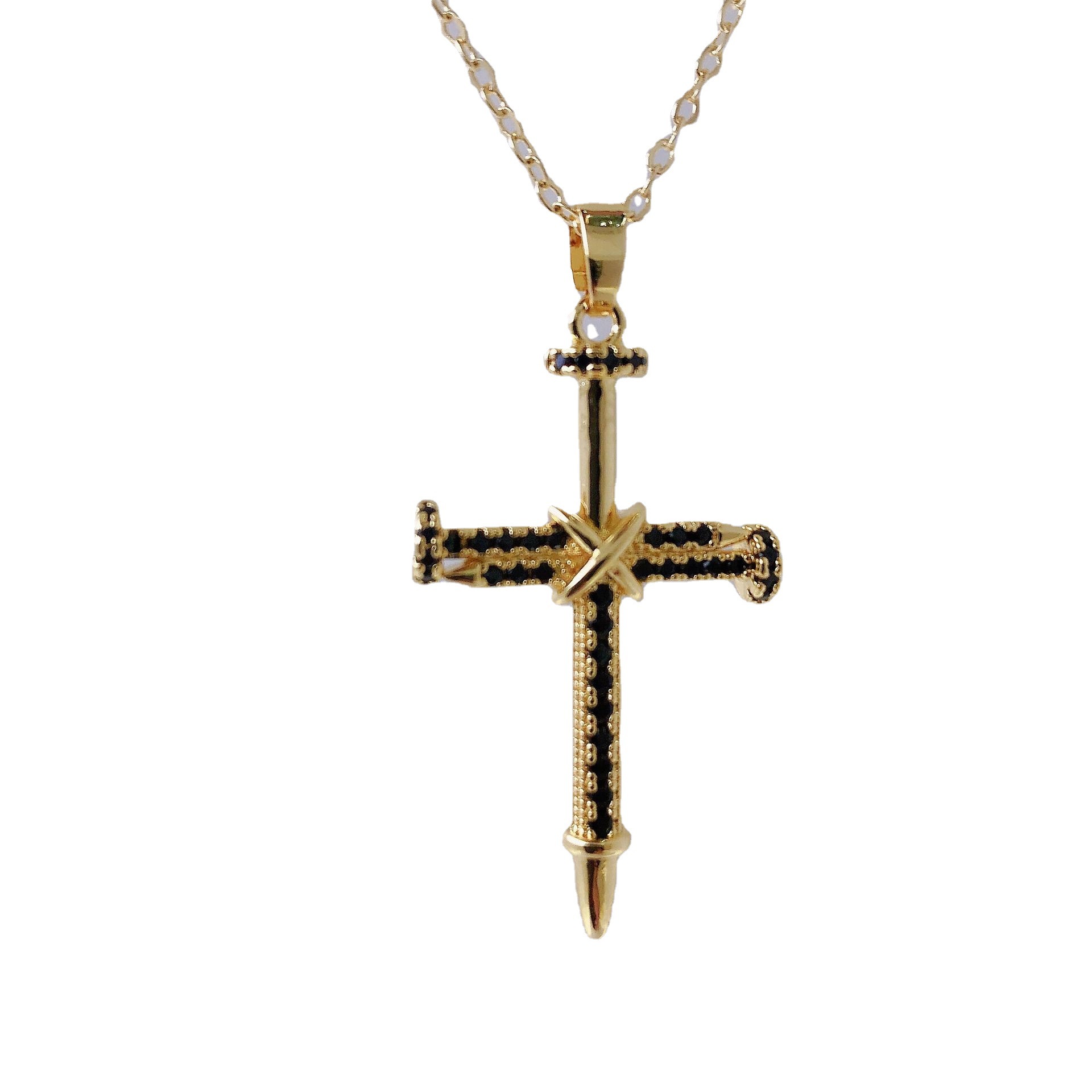 14K Gold Personality Hip Hop Clavicle Chain Nail Cross Necklace Pendant