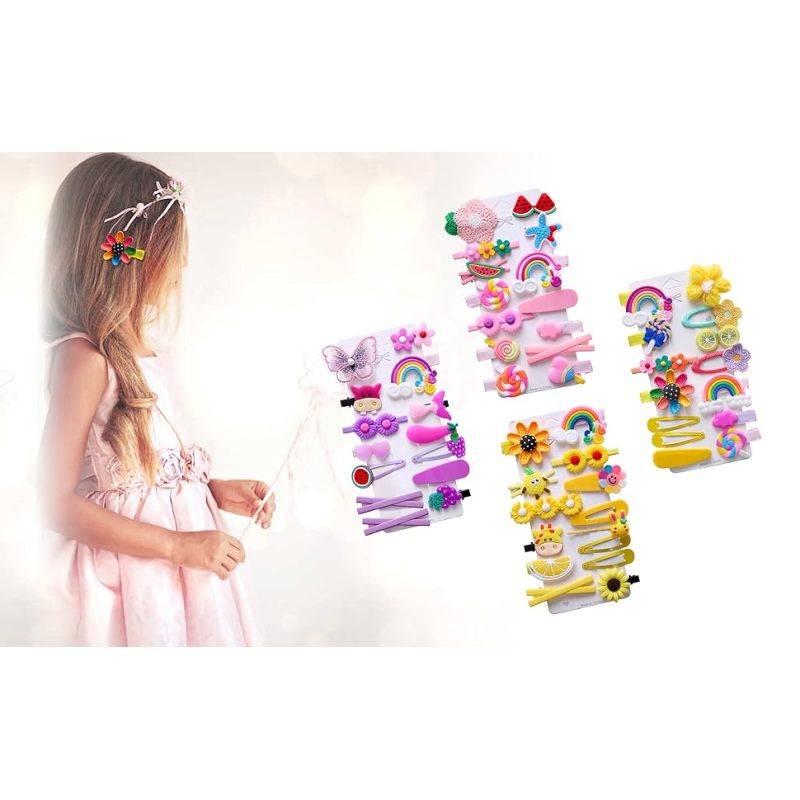 Lovely style combination: The baby hair clips set Includes 14 pcs multiple patterns with candy rainbow, flower, cloud ,lollipop ,fruit, ice cream shaped design, can be matched with different clothes, candy, rainbow, flowers, fruits, animals, etc. Suitable for babies with both thin hair and thick hair.