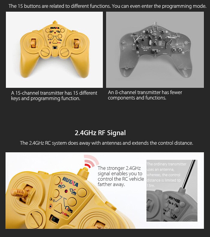 - Full Functionality: This 15-channel RC Digger gives you the most real experience from a "toy". From the bucket and the arm to the rotating platform, each part that a real excavator can function, you can expect from this model