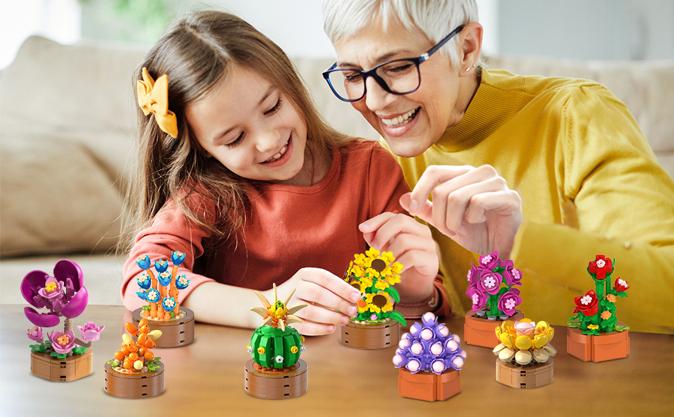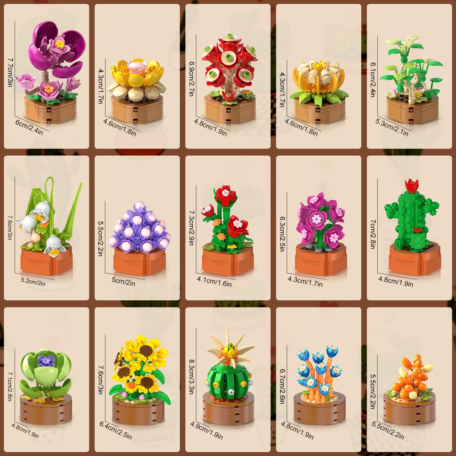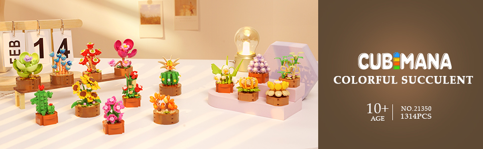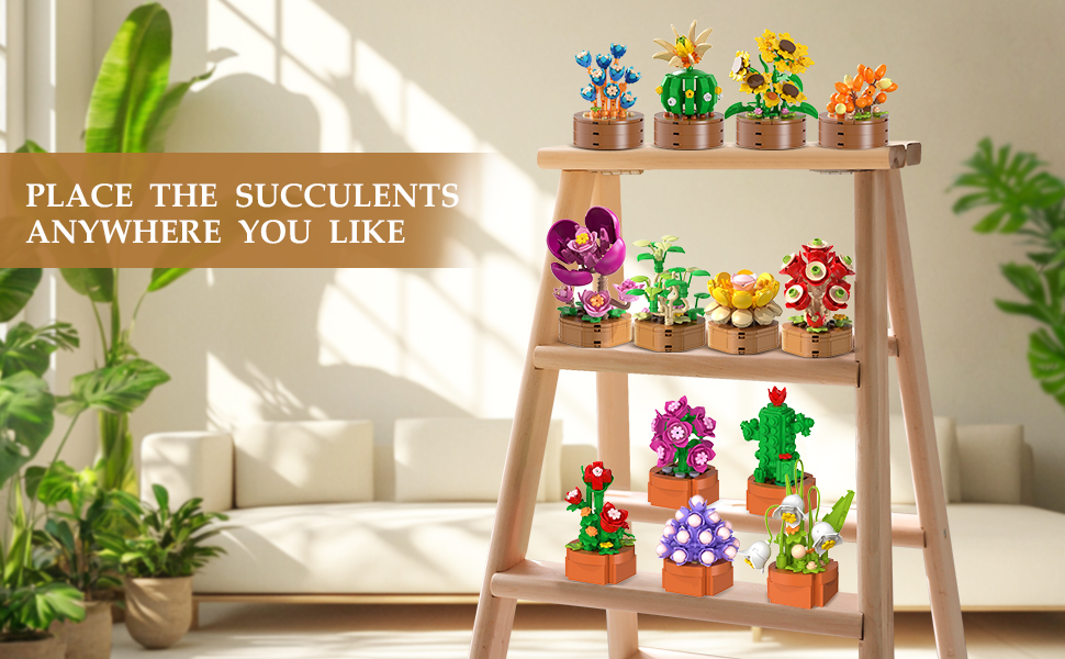 This botanical building set features 1314 pcs mini blocks and that construct 15 pack succulents plants, each with its charming terracotta pot. Each plant has been carefully designed to capture the look of a real succulent.
