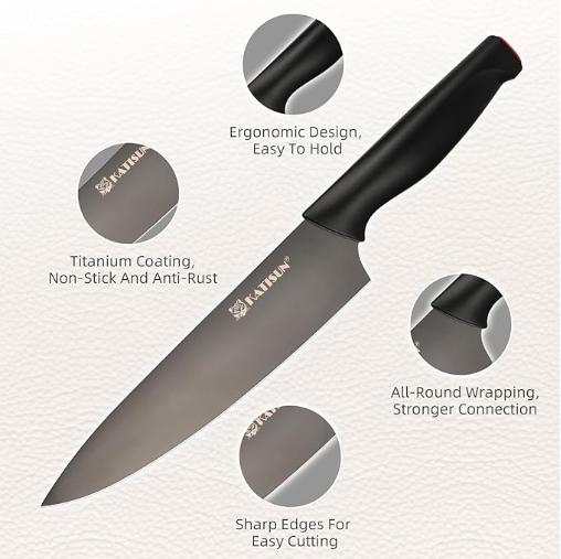PREMIUM CRAFTSMANSHIP - Knives are crafted with high carbon stainless steel imported from Germany. After Special process treatment improves characteristics of the steel. The black titanium plating process greatly improves the rust resistance of the blade, so you don't have to worry about rust and oxidation for a long time in the future. Our knives boasts an official Rockwell hardness rating of HRC 53 ± 1, and the 25-degree hand-polished edge on each side