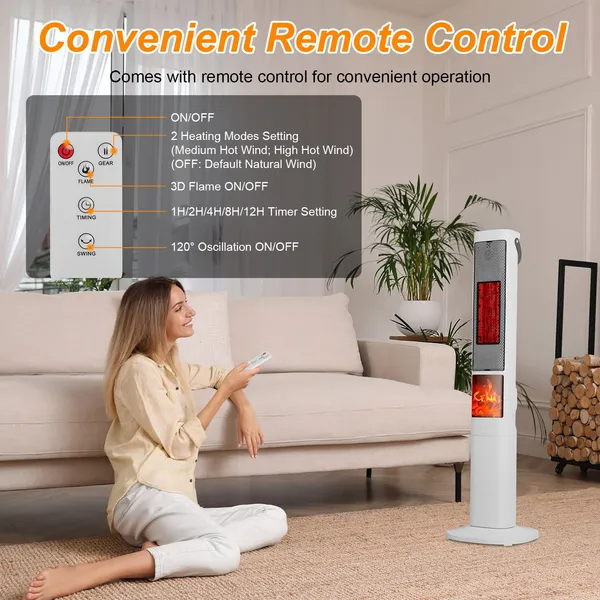 *Easy Operation*:Simply tap the button on the touch panel to change wind mode/set flame mode/adjust timer or set swing mode. You can also use the remote control within 2m/6.56ft to operate conveniently. Besides,equipped with a leather handle strap for easy carrying and moving.