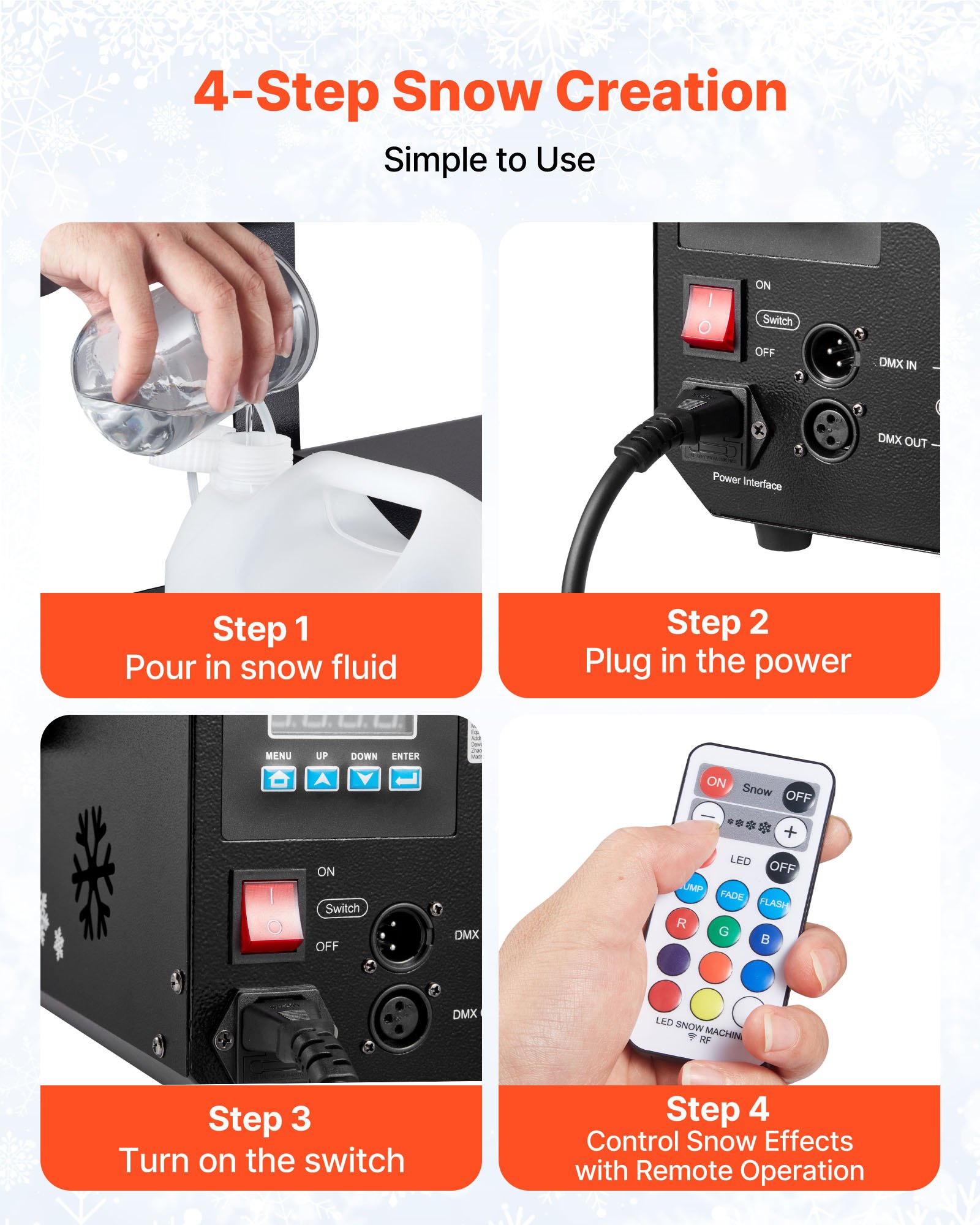Adjustable Control Design: This fake snow machine supports DMX512, wireless remote, and onboard panel control, allowing you to easily adjust snow output and speed from a distance. Paired with customizable RGE ambient lighting, it matches flexible scenes without approaching the machine, enhancing convenience and efficiency.