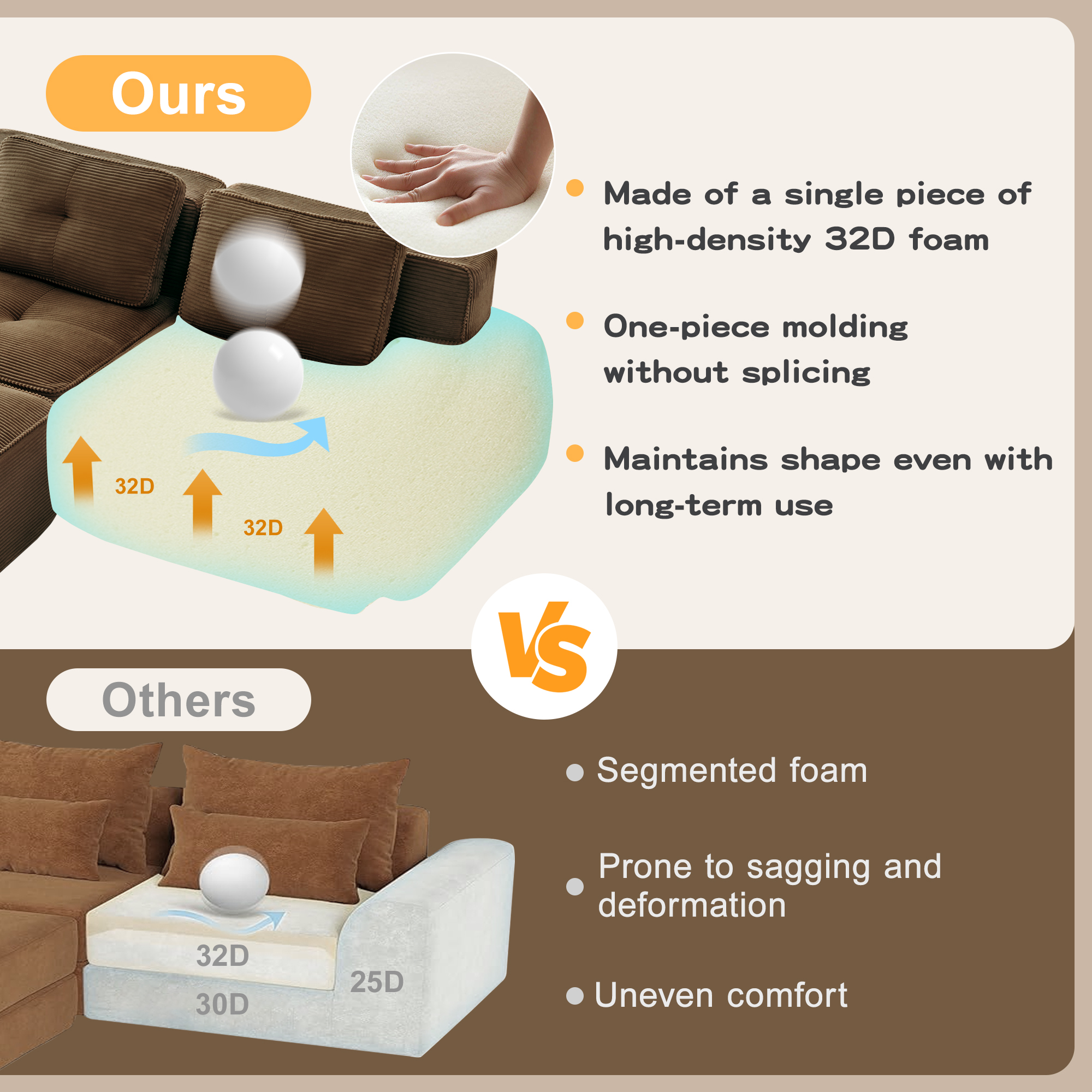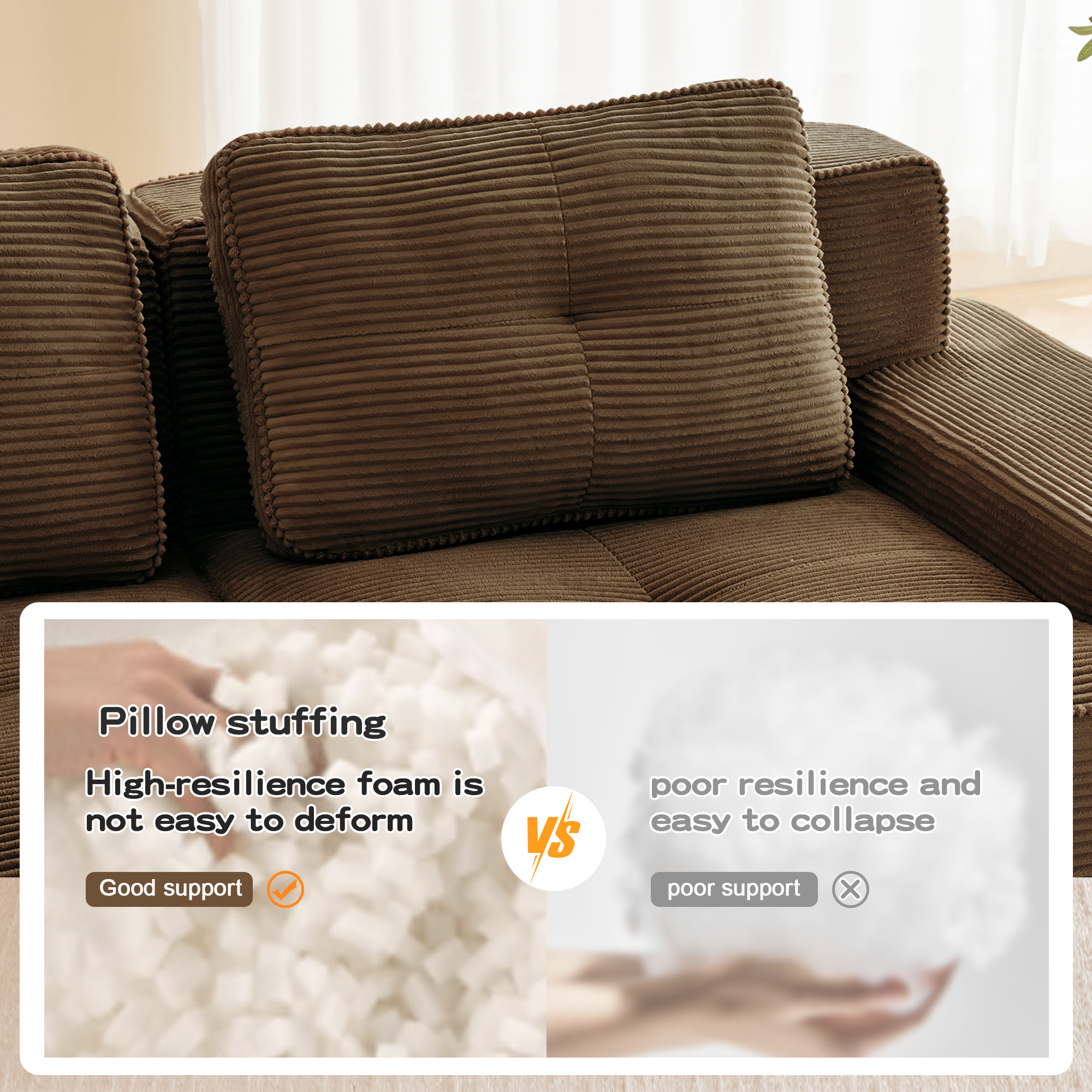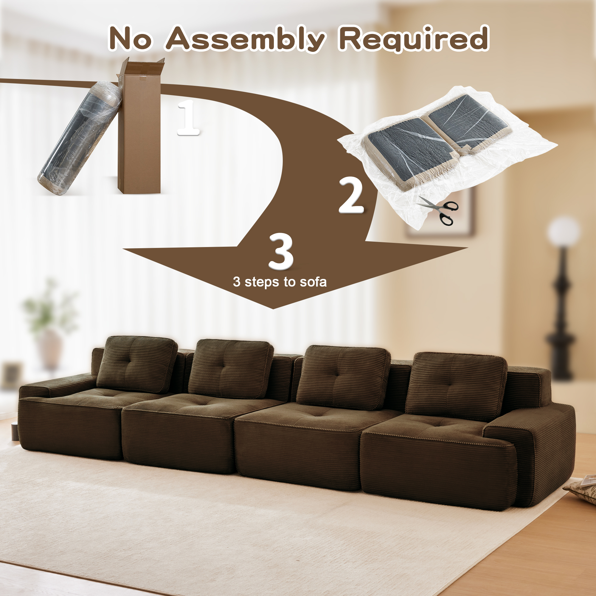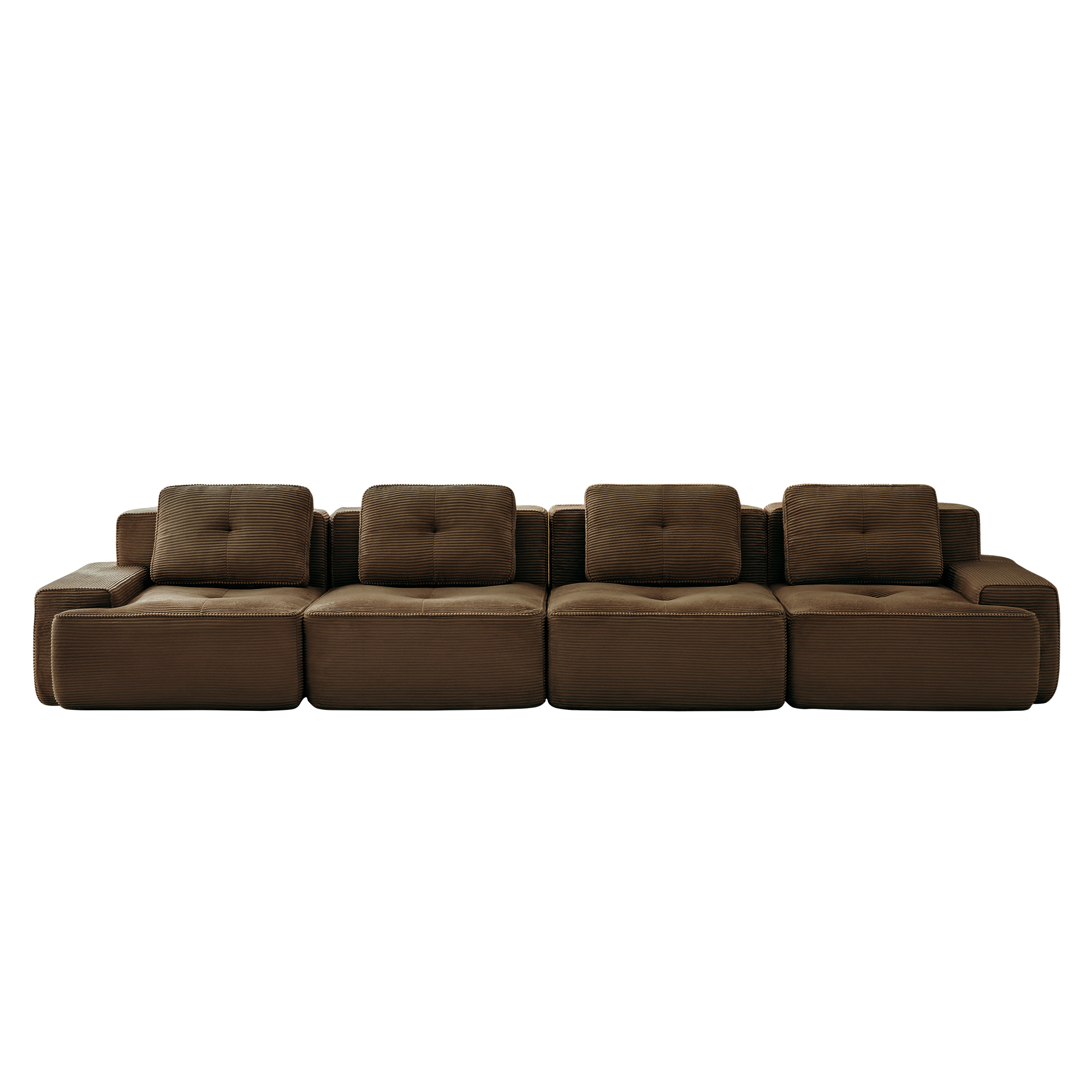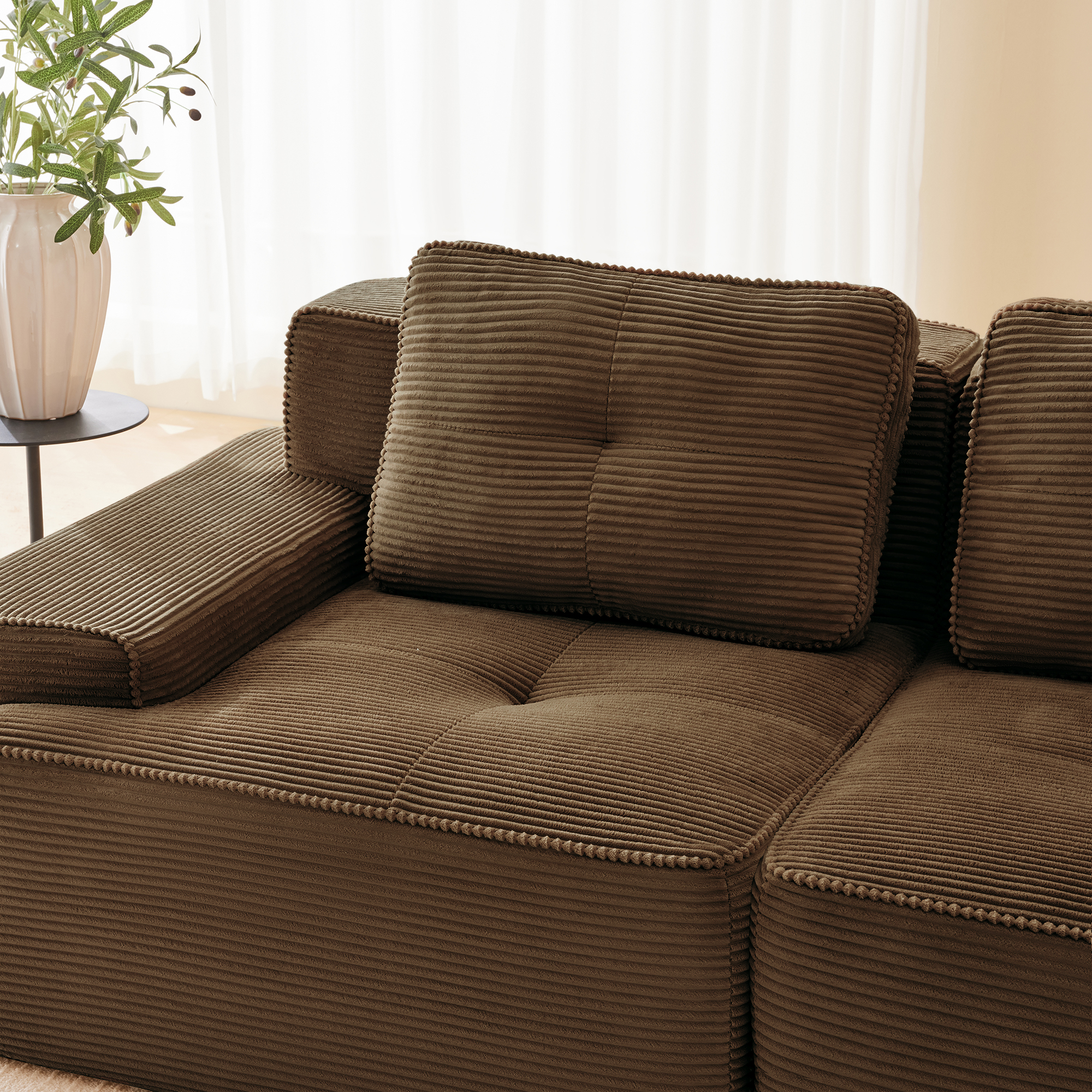 Product Name:153" Modern Modular Sectional Sofa for Living Room, Corduroy Fabric,4-Seater Couch with Deep Seat, Pearl-like piping, Tufted Design, Buckle connection, No Assembly, Anti-slip Design, Brown