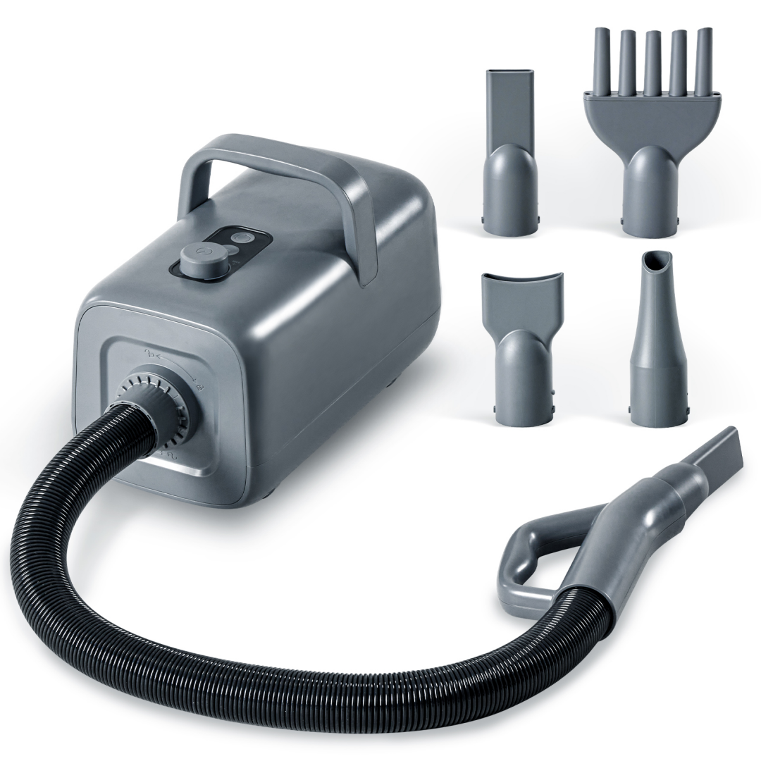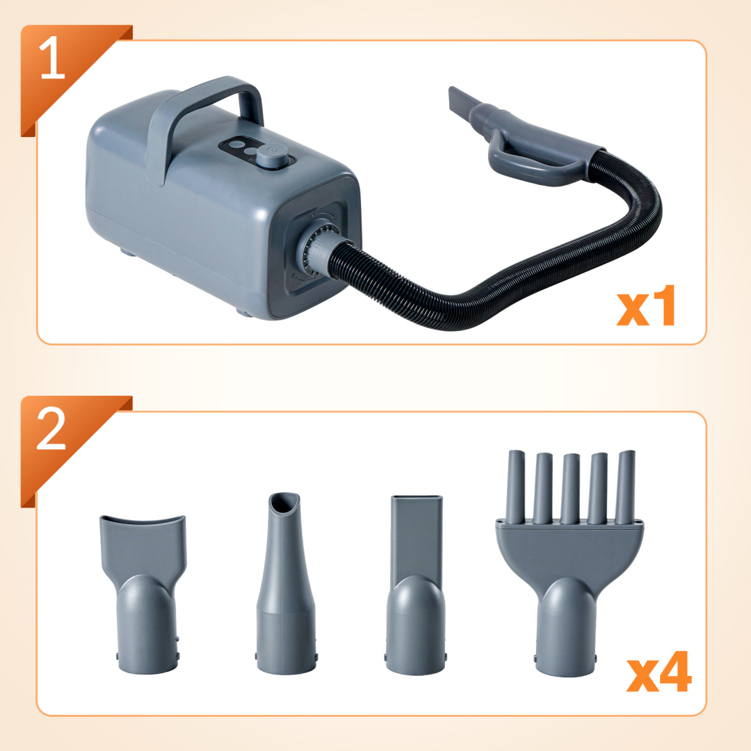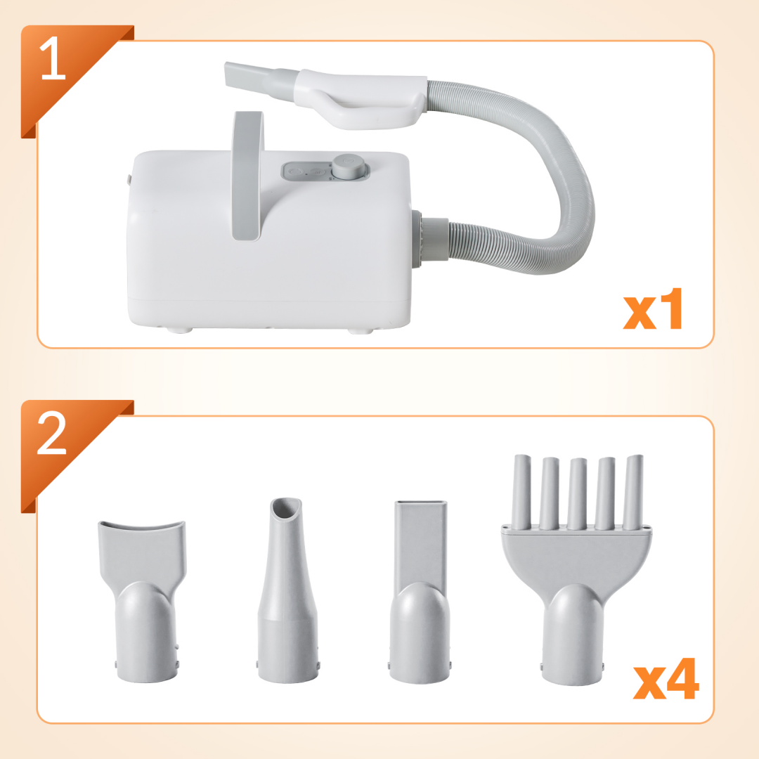 Rich accessories: equipped with 4 interchangeable nozzles, customizable drying method according to pet type; The ergonomic handle is compact and lightweight, making it easy to carry.