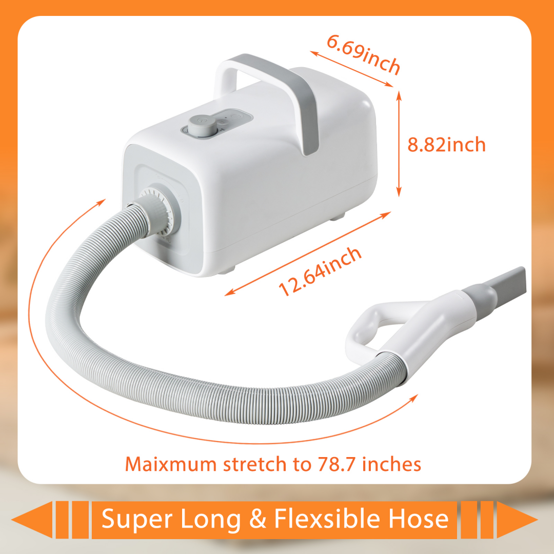 Pet friendly design: Equipped with a durable integrated ABS shell and advanced noise reduction technology, the operating noise is only 48-72 decibels, which is 15 decibels lower than ordinary water blowers. The low-noise design can keep anxious pets calm and suitable for sensitive animals; And the flexible hose can extend up to 6.56 feet (2 meters), ensuring a safe and hassle free beauty process.