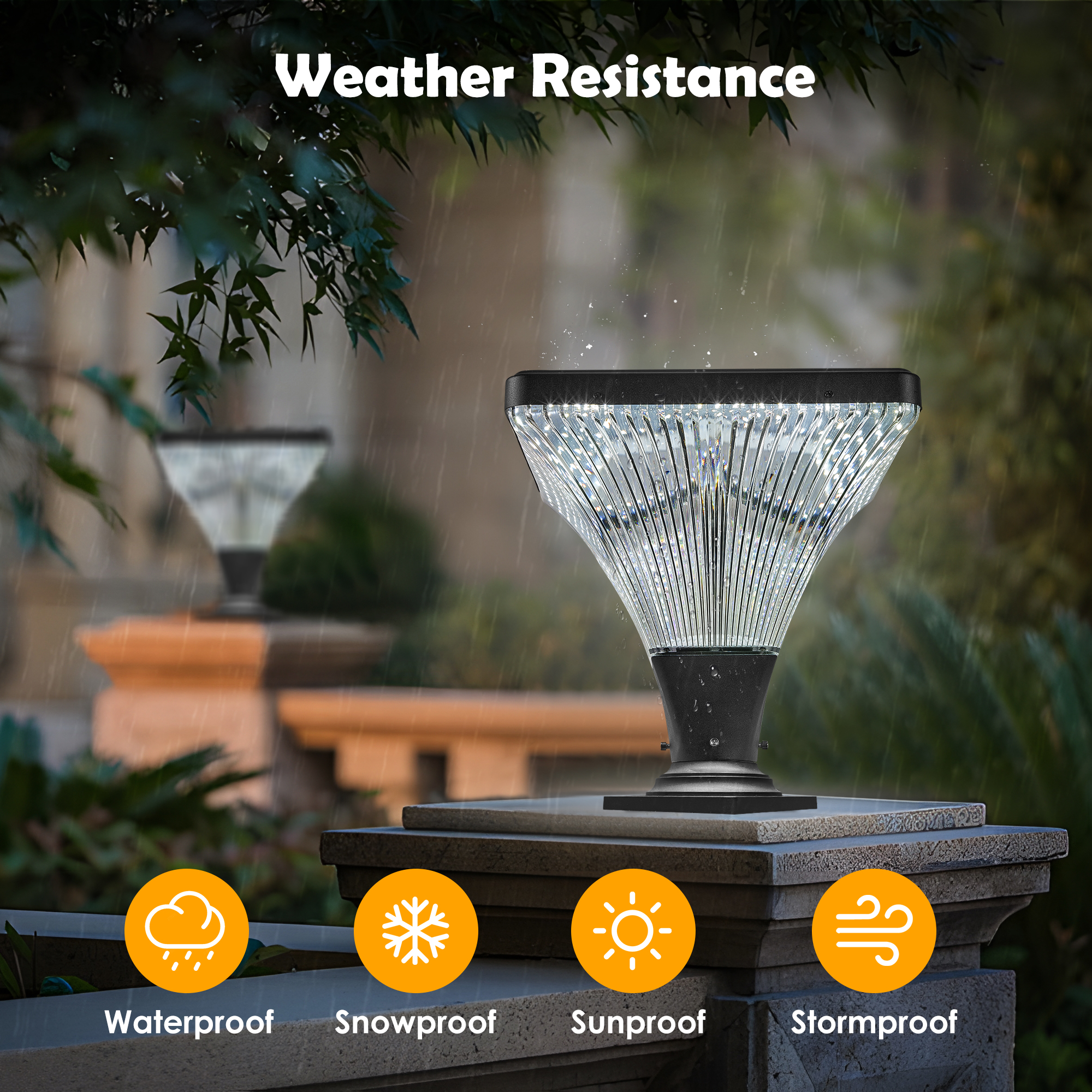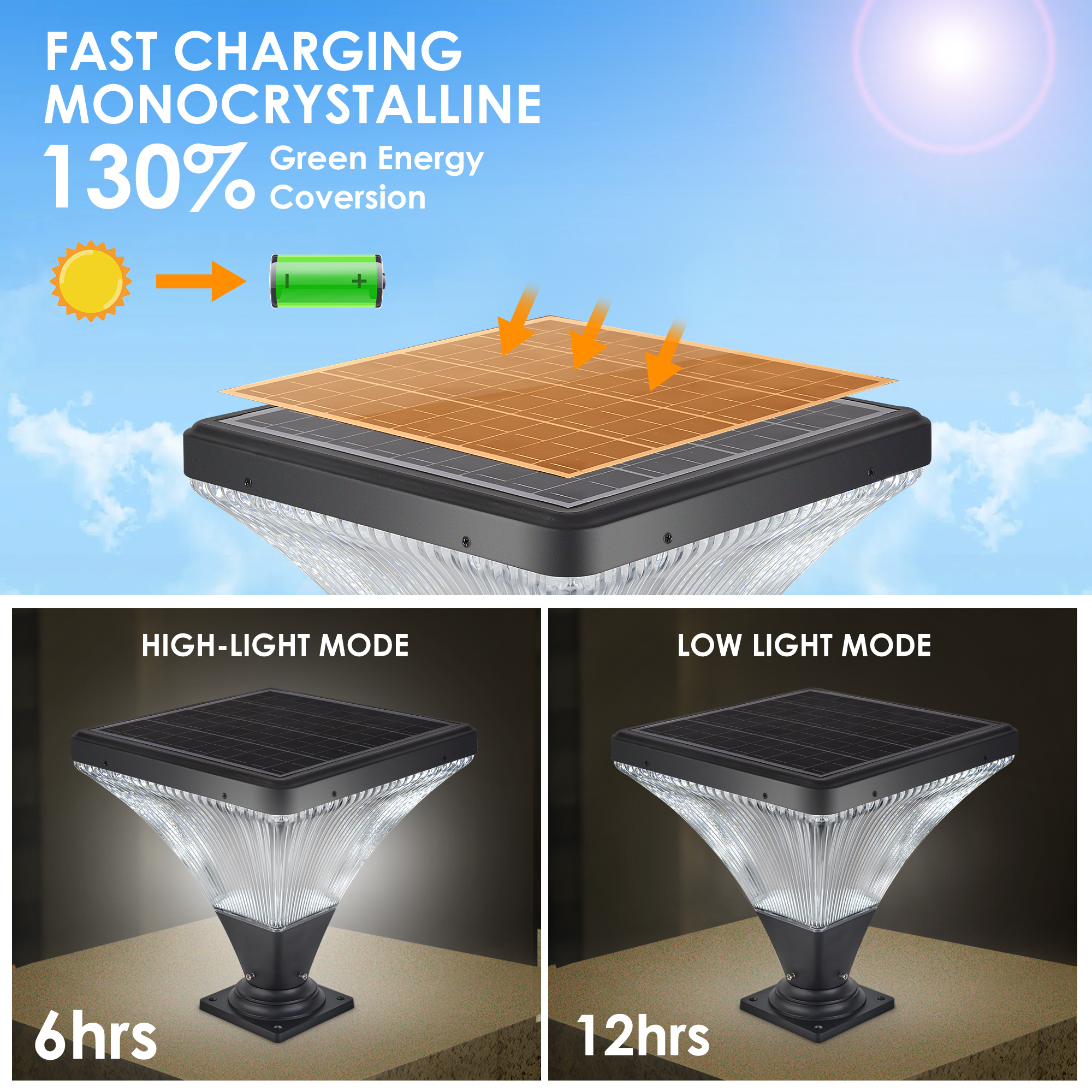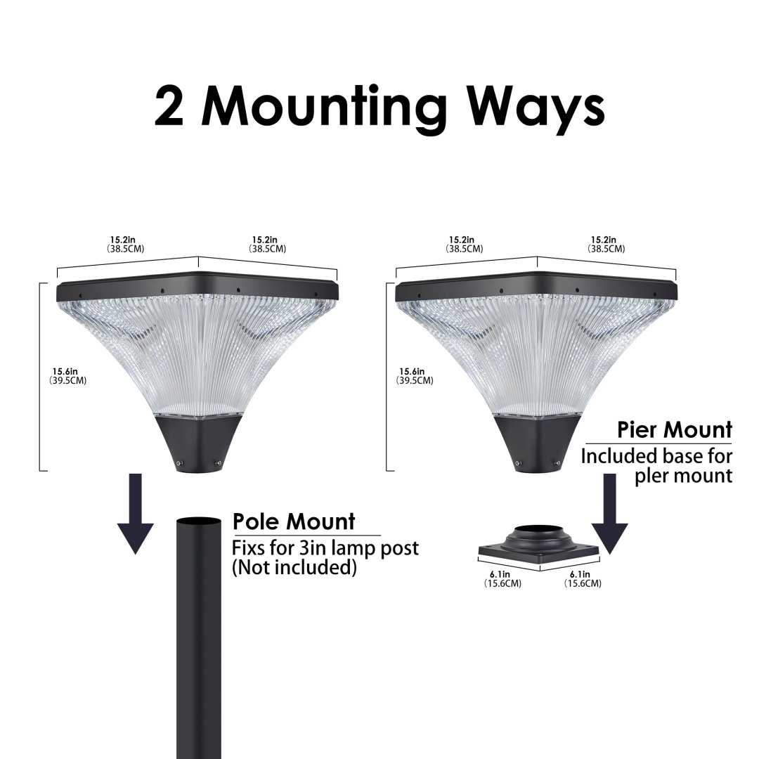 Flash sand black, aluminum plus PC material, crystal diamond stripes refractand shine like diamonds, looks simple and beautiful.Landscape solar light head color temperature(6000K) and has a timing function, which is convenient for you to adjust.Excellent materials, single crystal silicon solar panels have alarge lighting area, high energy storage and fast charging.Landscape solar lamp head contains anti-oxidation PC lampshade, which is resistant to high temperature, not easy to change color.