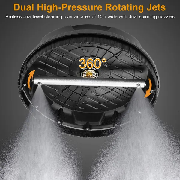 *Cleaning Floor Effectively*:Pressure washer surface cleaner delivers professional level cleaning over an area 15in wide with two spinning nozzles. The tough and flexible bristles protect work surface and controls over-spray. Splash-free design keeps you dry while you clean.