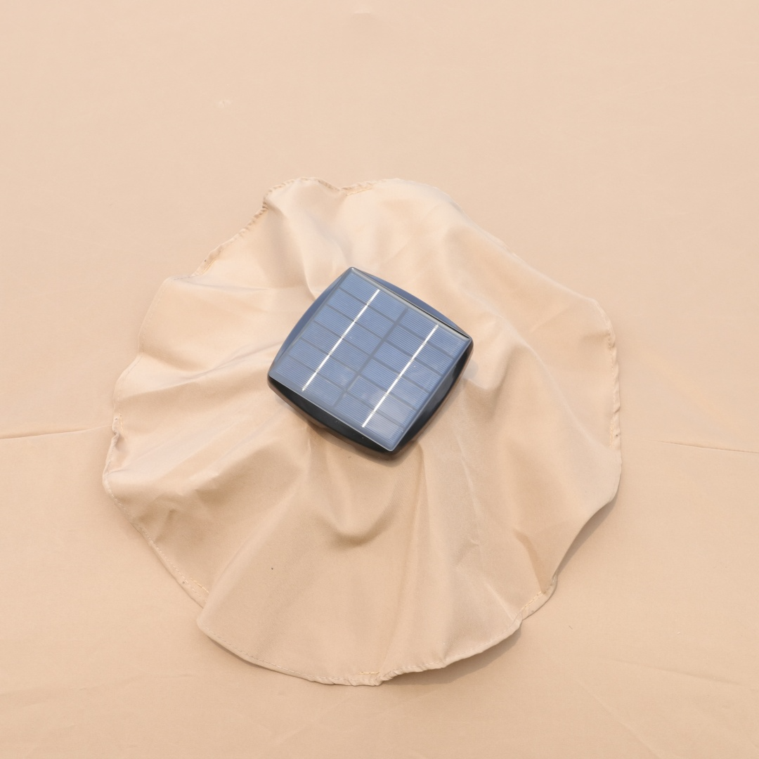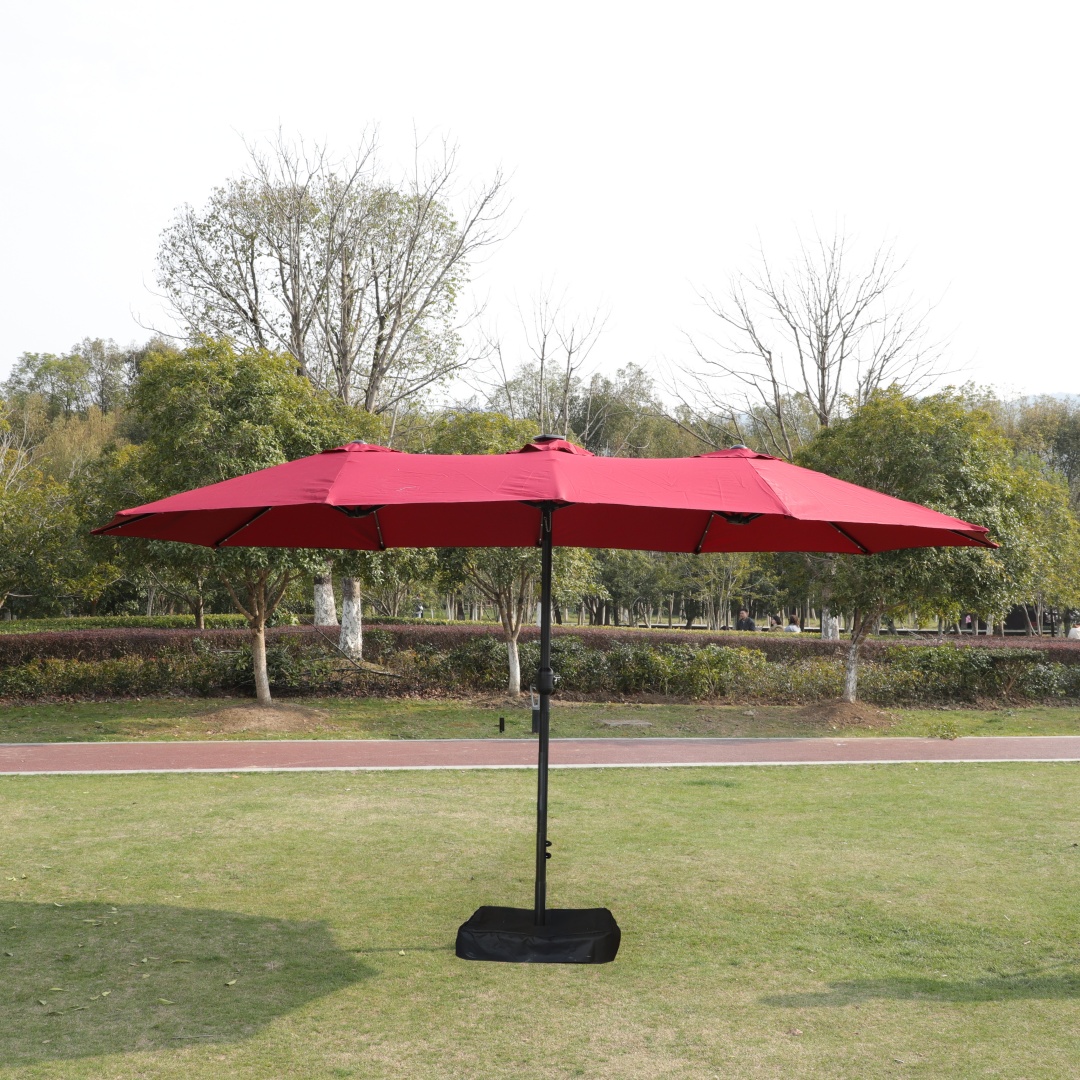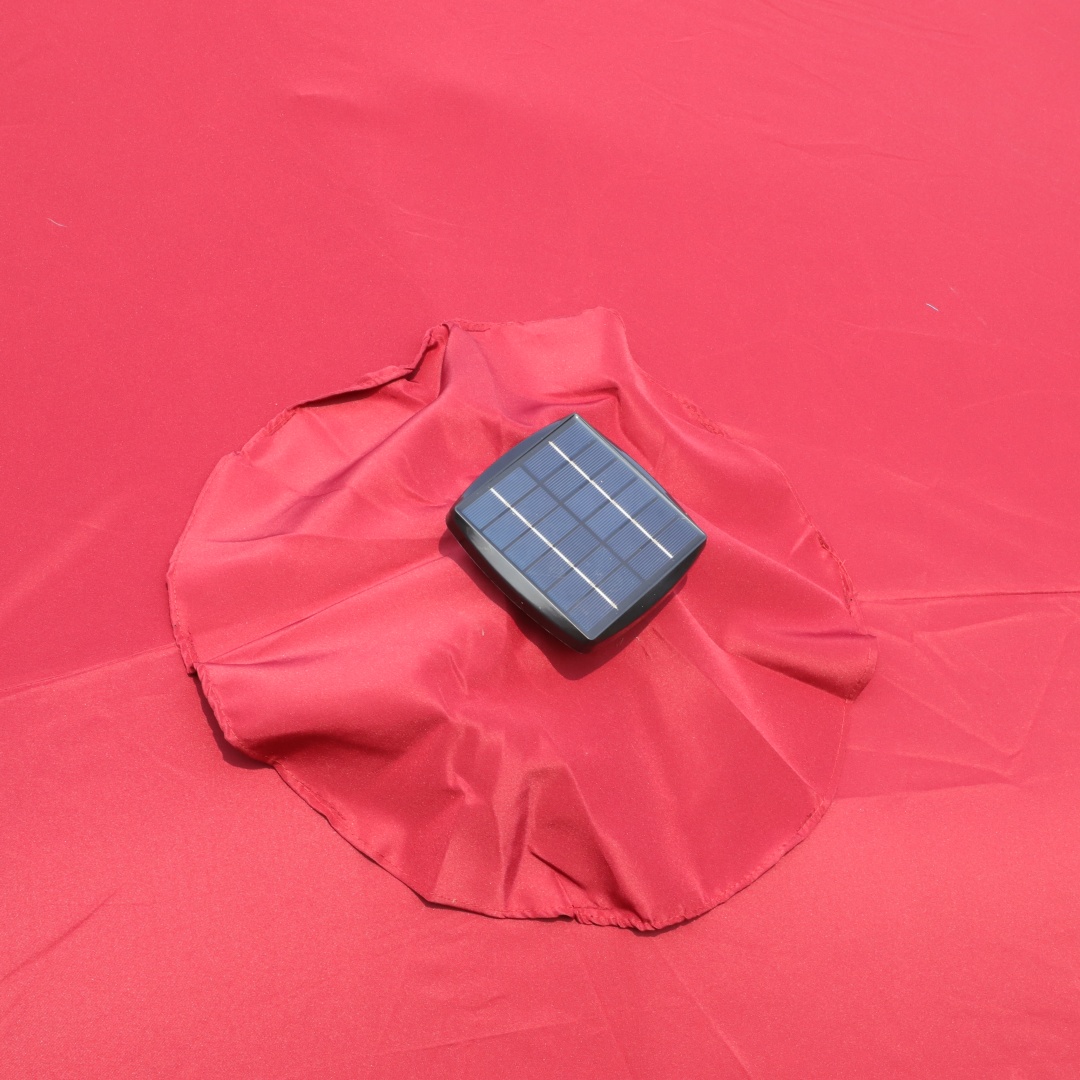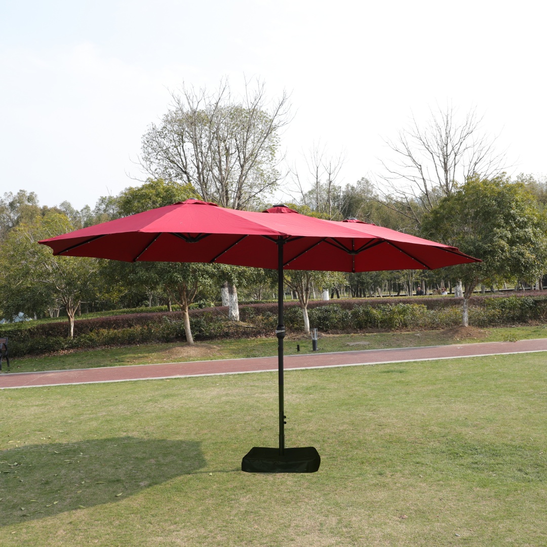 There are 4 lights on each umbrella rib. With 12 umbrella ribs in total, there are 48 lights in all. This unique choice double-sided rectangular patio market umbrella made of thick steel pole and quality polyester, which is anti-rust and waterproof that great for outdoor use. The 15 ft patio double-side umbrella provides an ample shade to keep you cool and protect from hot sun. The extra large double-sided design also matches your desk and chair and provides more shade area. You can easily use the crank to turn it on or off which is not only laborsaving but also safe. Vents give you more coolness and safety because it allows airflow and reduce wind pressure. Assembly is easy and can be done without the aid of tools.