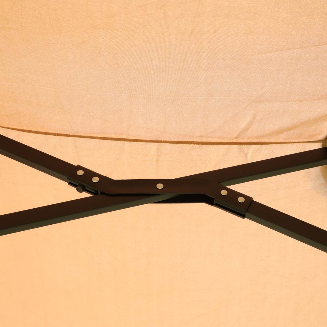 Canopy Shape: Rectangular Canopy Color:Taupe Pole Color: Black Canopy Material: 180G Polyester Pole Material: Steel UV Protection (UPF)z: 50+ Canopy Durability: Weather Resistant; Water Resistant; UV Resistant Color Fastness: Up to European Standard Level 4 Wind Vent: Yes Opening Mechanism: Crank Lift Adjustable Height: No Lighted: YES Package Includes: 1 x patio double-sided umbrella; 1 x instruction Stand Included: YES Supplier Intended and Approved Use : Residential Use Recommended Counter Weight: 127.87 lbs (58 kg) Installation Required : Yes Level of Assembly: Partial Assembly Adult Assembly Required: Yes Suggested Number of People: 1 Additional Tools Required: Tool Free Assembly Additional Parts Required: Yes Assembly Instructions Included: Yes