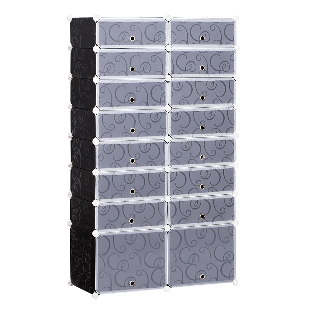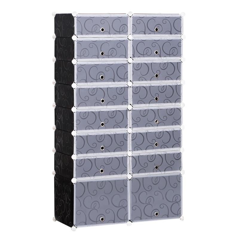 Declutter your home efficiently with this semi-transparent shoe rack. Made from plastic with a metal frame, this storage unit is tough for everyday use. Featuring 14 regular cube compartments and 2 larger to fit a total of 32 pairs, the shape is completely customisable to allow the organizer to fit your needs well. Simply connect using the ABS connectors. It is finished with a swirl pattern design on the front for an elegant look, no matter where it is placed.