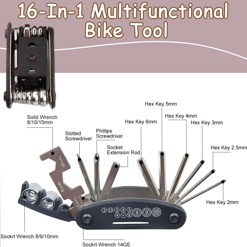 16-in-1 Bike Tool Kit With Tyre Repair & Valve Core Tool, Portable Bike Repair Kit For Road & MTB, Compact Bike Multi Tool Set, Essential Bike Tools Kit Set With Bag, Durable Bike Tool And Bicycle Too