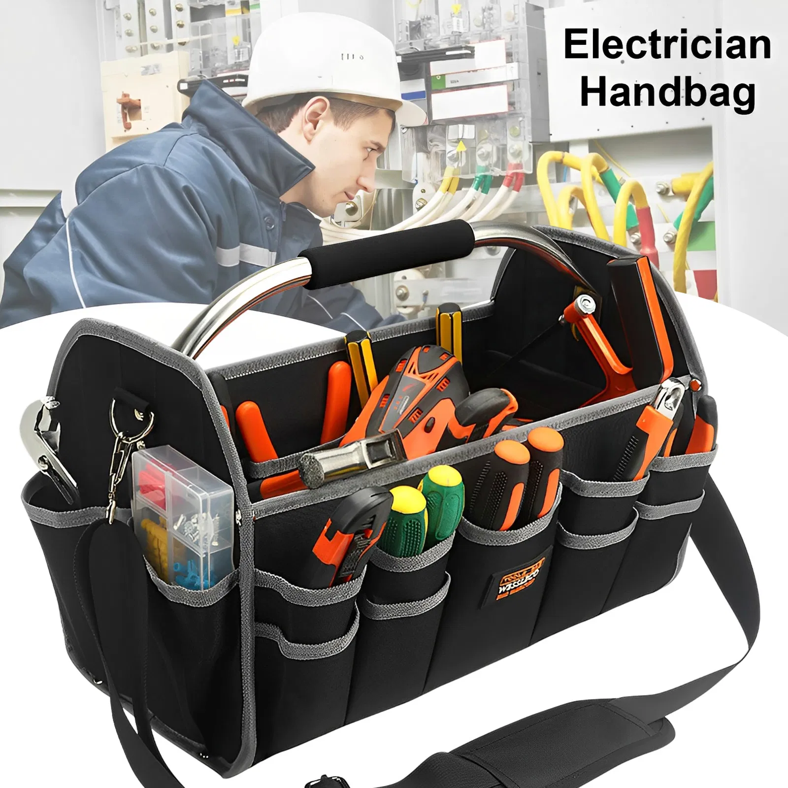 This tool carrier is suitable for various scenarios such as electrical work, plumbing, woodworking, automotive repair, home DIY, gardening, and more. It is an ideal storage choice for small electrician's basic hand tools.