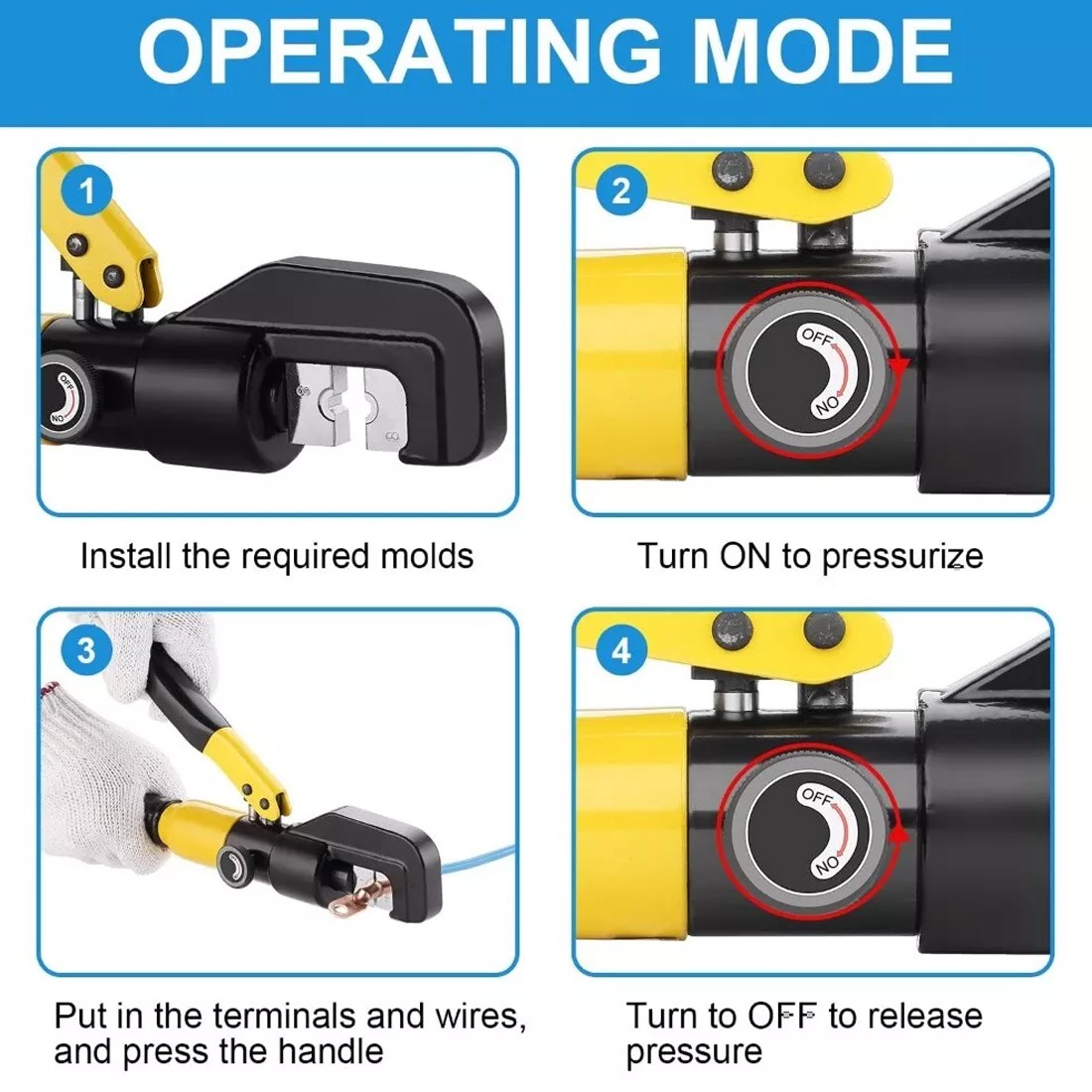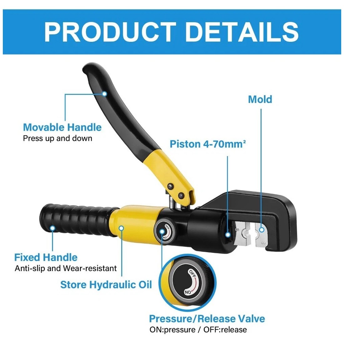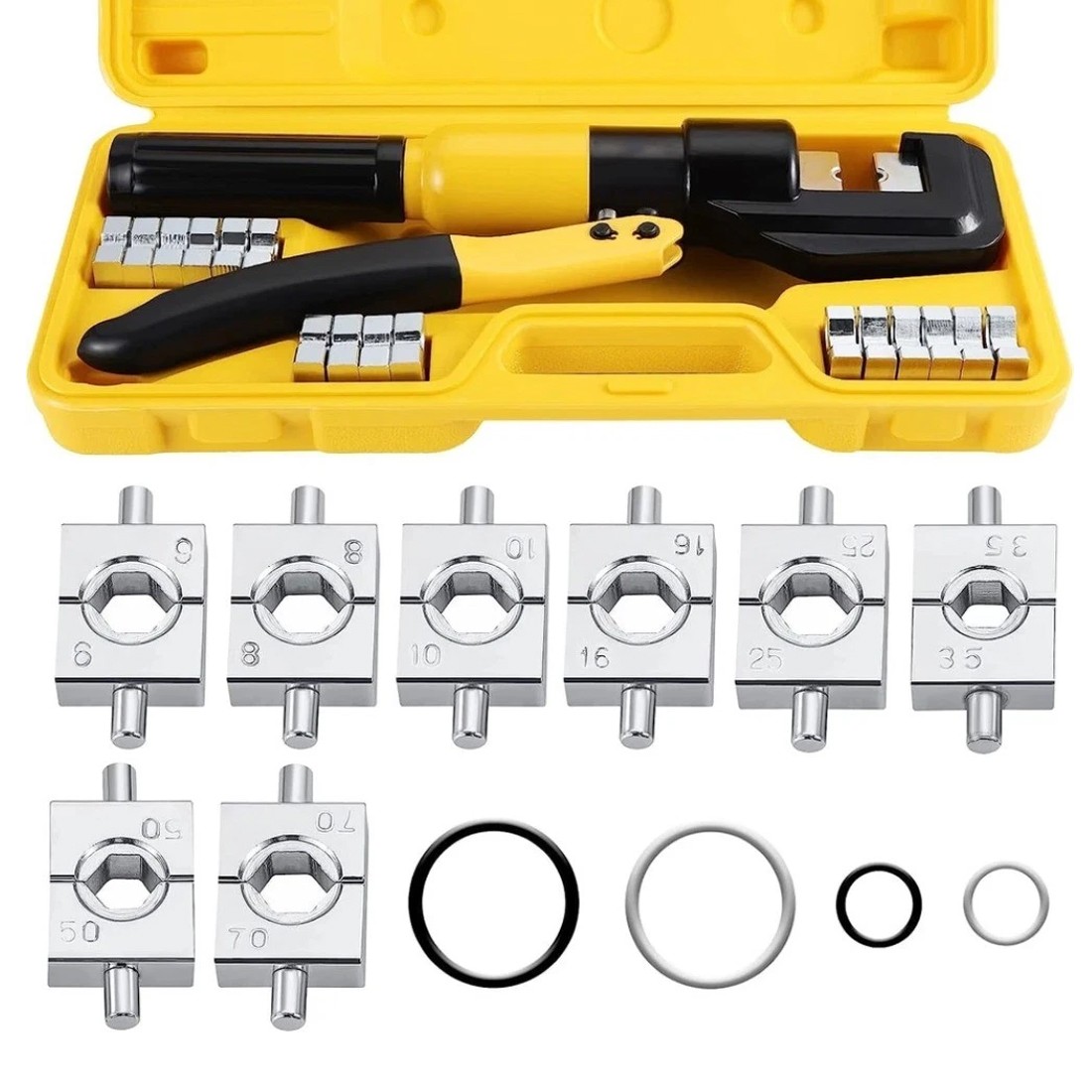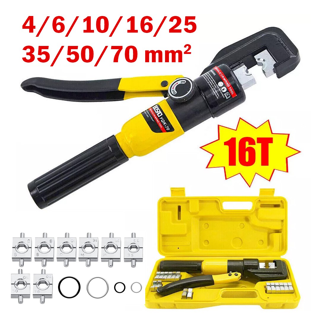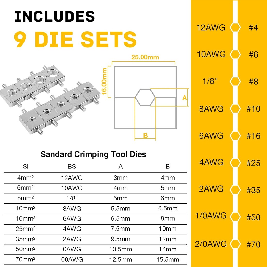 8 pairs of hexagon crimping dies included: 4, 6, 10, 16, 25, 35, 50, 70 mm²; crimps AWG 12 to 2 / 0 size aluminum and copper wire, perfect for battery, welding cables, power wires and electrical cables