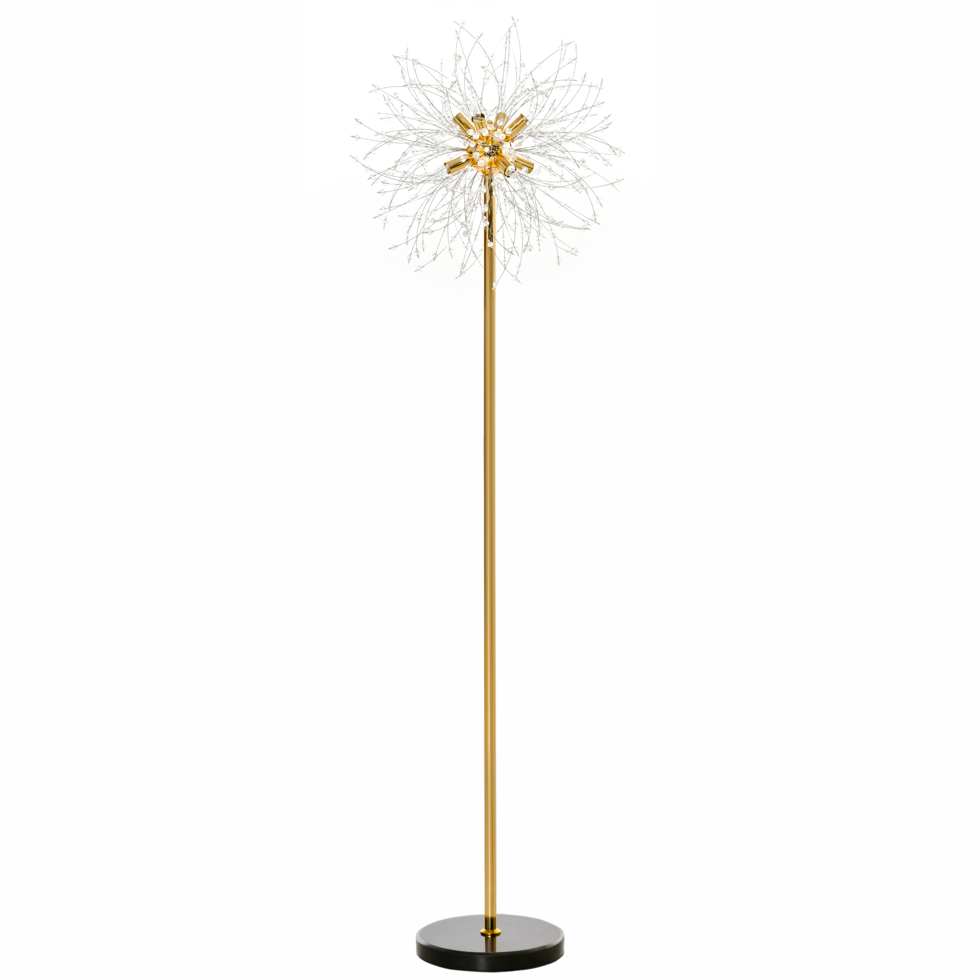 Elegant home decoration with this floor lamp. A dandelion flower design, where all strands are fitted with crystallite beads - catches the light and sparkles. A metal frame for a strong core, finished in a gold tone for extra elegance. Complete with a foot switch to turn on/off, and a marble base to keep weighted.