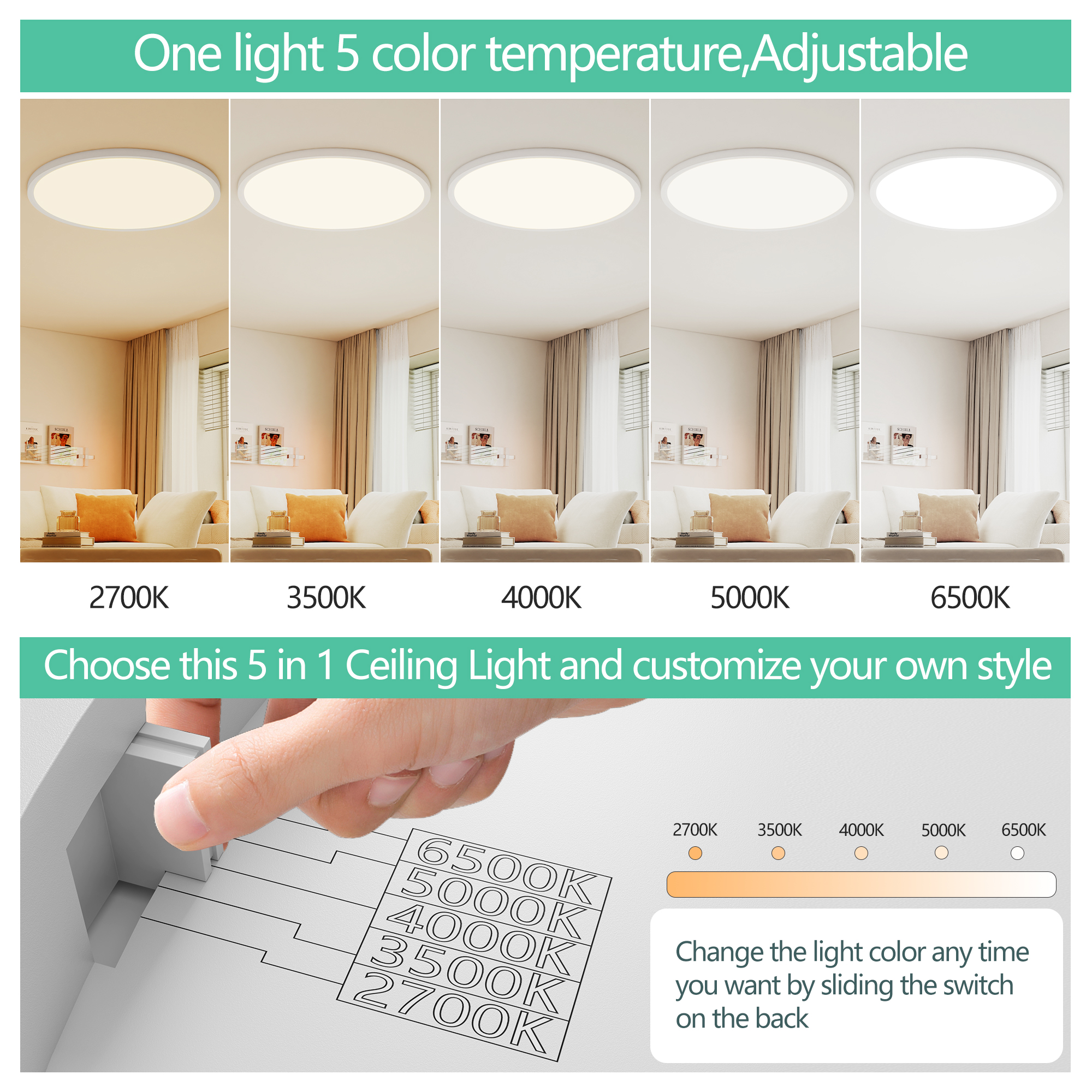 5 COLOR TEMPERATURE ADJUSTABLE and DIMMABLE: The ceiling light can be dimmable and has five color temperatures selectable 2700 K, 3500 K, 4000 K, 5000 K, 6500 K; You can select the desired color with a back of a toggle switch; The 16 inch flush mount light fixture is compatible with most LED dimmers, and brightness can be adjusted from 10%-100%; NOTE: Wall switch is not includedEASY INSTALLATION for ONE PERSON: The flush mount ceiling light comes with a safety wire rope, no need for someone else to help you lift the lights; You can install the surface mount lights in four steps in a few minutes; Before you start, make sure to turn off the powerBACKLIGHT LIGHT FUNCTION: To increase the light angle of the lamp, our engineers added an extra ring of light beads on the back of the lamp; The backlight design reduces dark areas in ceilings and makes your room brighter; Note: The backlight is lit at the same time as the front light, not aloneULTRA BRIGHT and LOW CONSUMPTION: The brightness of this 32 W 3520 lm is equivalent to a 200W traditional bulb; Dimming ranging from 100% to 10% allows you to control the brightness of your space