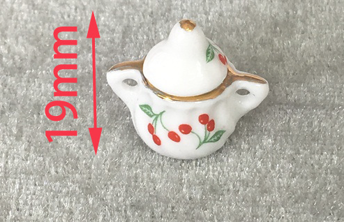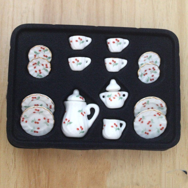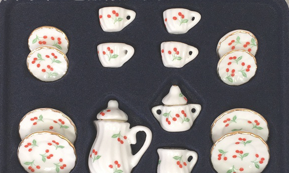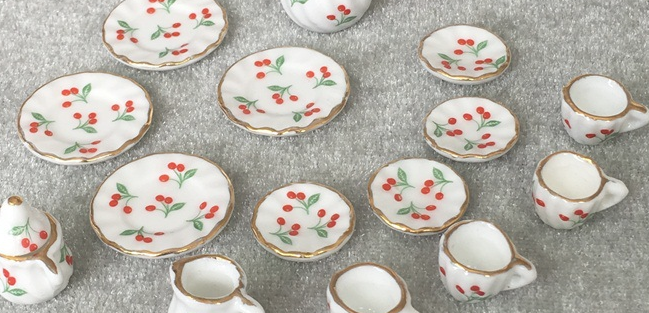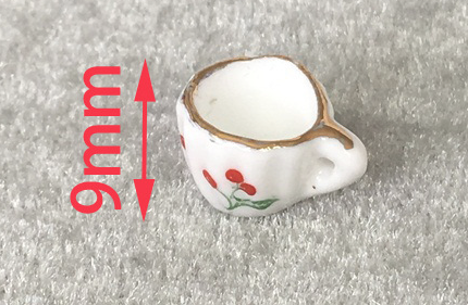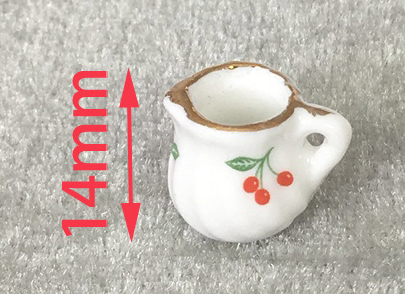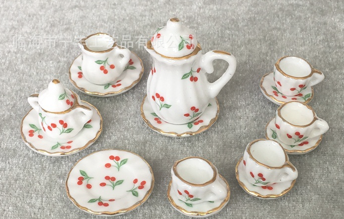 Dimensions: the teapot is 3.4cm high, the milk pot is 1.4cm high, the sugar pot is 1.9cm high, the large dish is 2.5cm in diameter, the small dish is 1.7cm in diameter, and the cup is 0.9cm high.