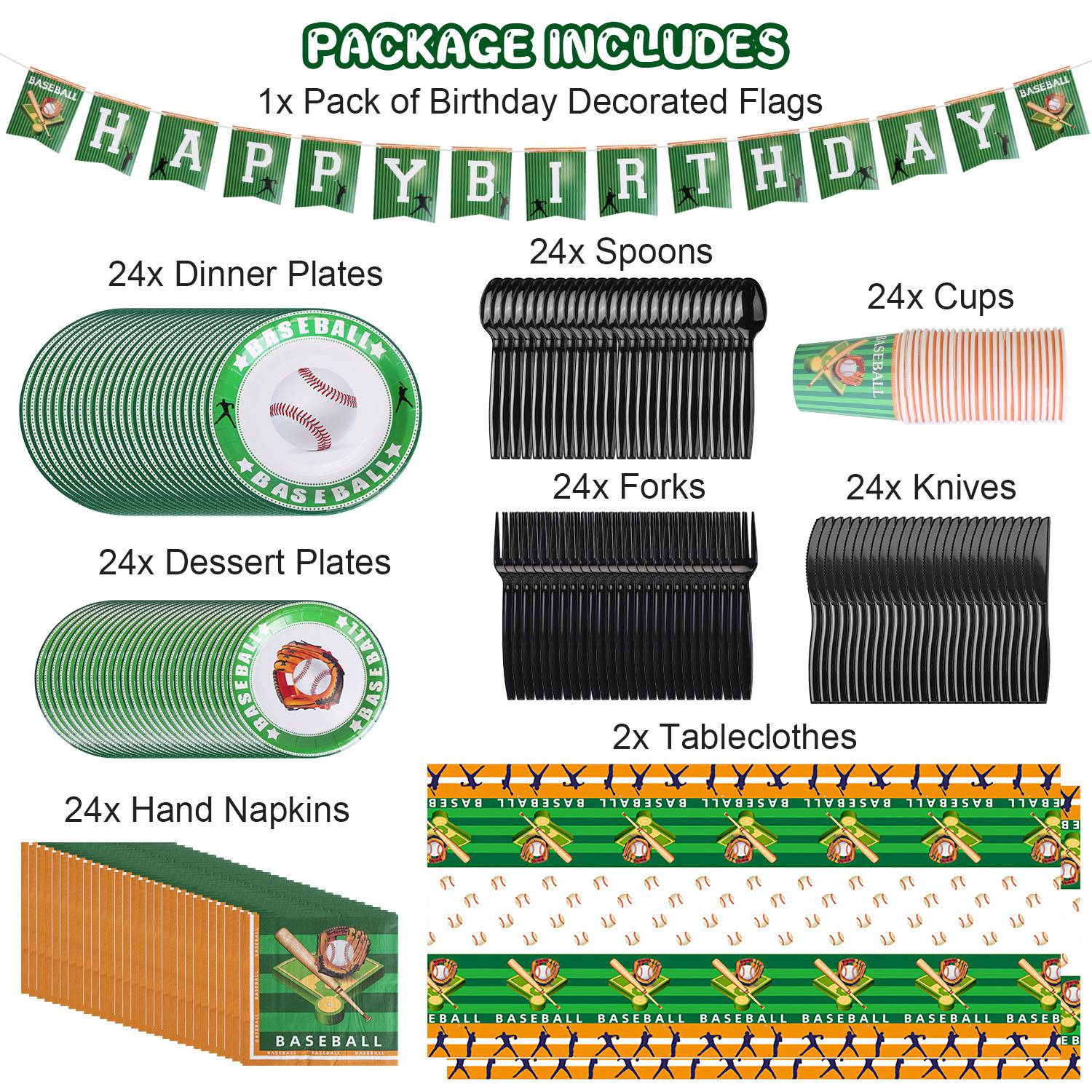 *Complete Baseball Party Supplies for 24 Guests*:Our baseball party supplies include complete essentials:24Pcs cups to contain drinks and juice;24Pcs forks,spoons,knives,dessert plates,dinner plates for eating and cutting salad,vegetables and meats;24Pcs napkins to wipe hands and mouths when finishing meal;2Pcs tablecloths and 1pack of birthday flags for decorating. 171Pcs baseball party dinnerware set is enough for serving up to 24 guests at one time.