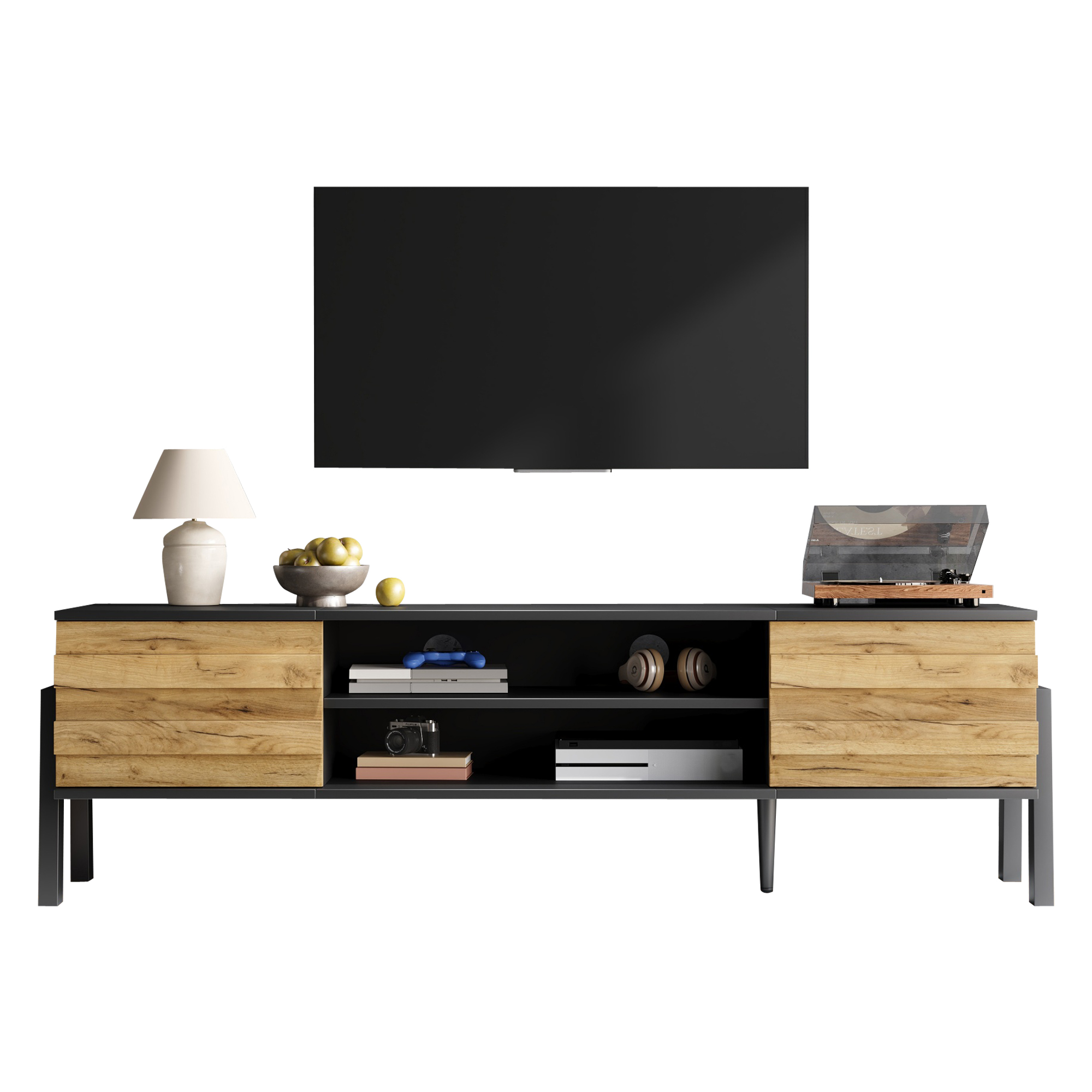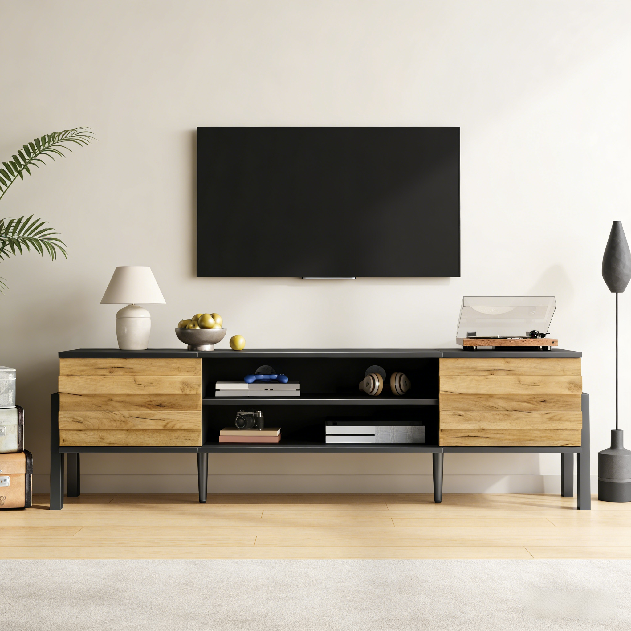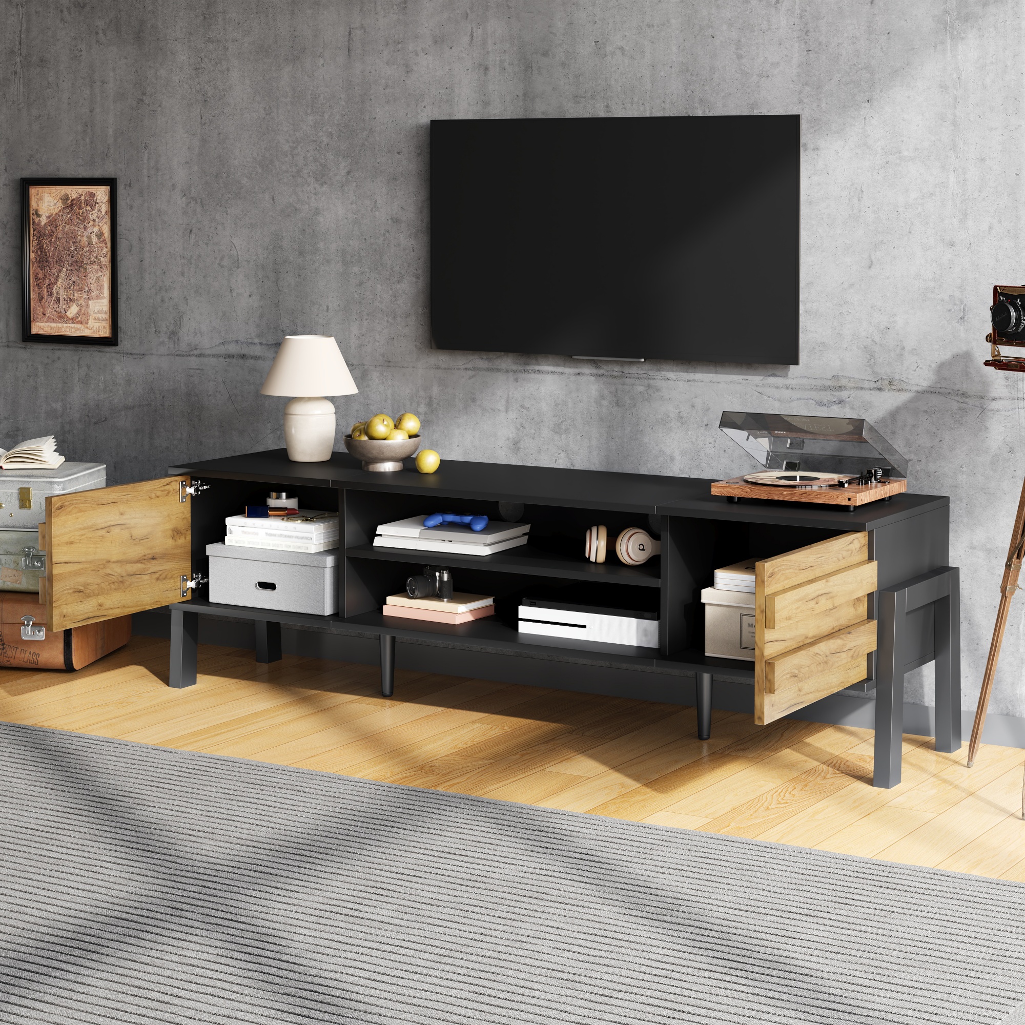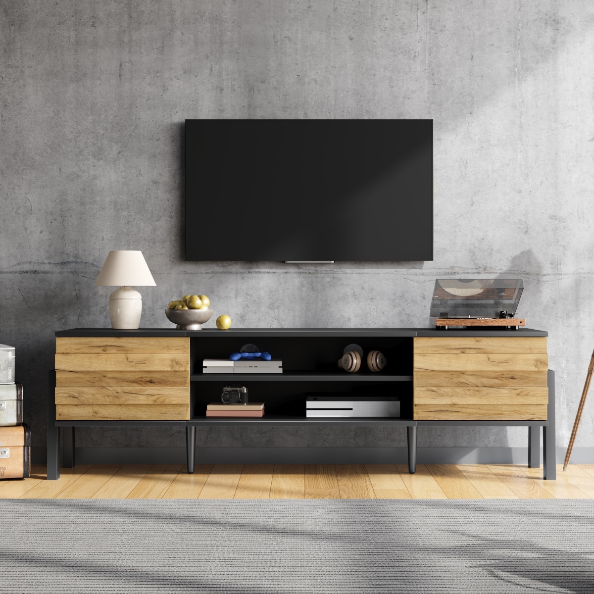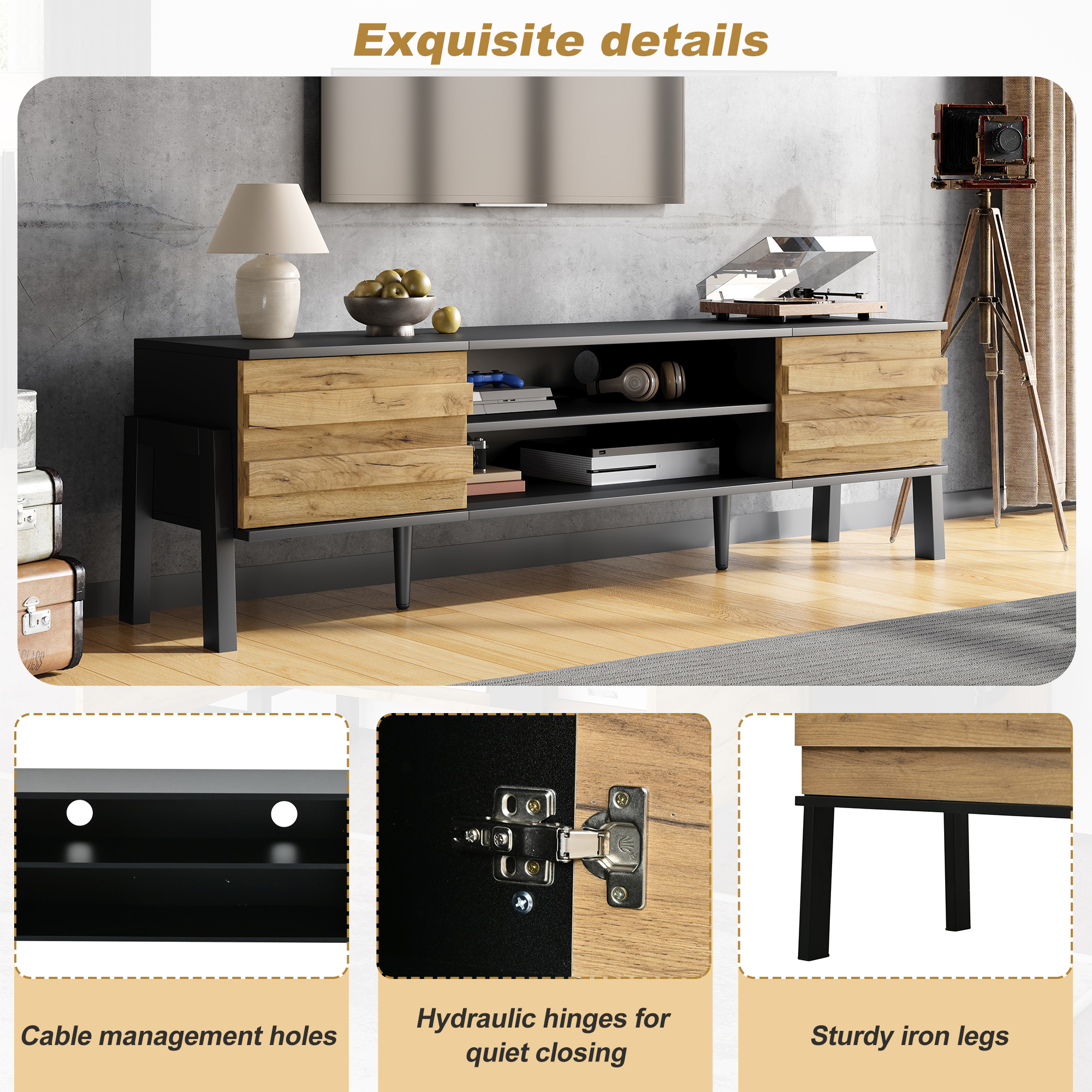 Product Name:175*39.5*53cm TV cabinet, TV board, TV console with 2 cabinets and open storage space, TV table, TV stand, living room cabinet, suitable for TVs up to 70 inches,Natural wood color + black