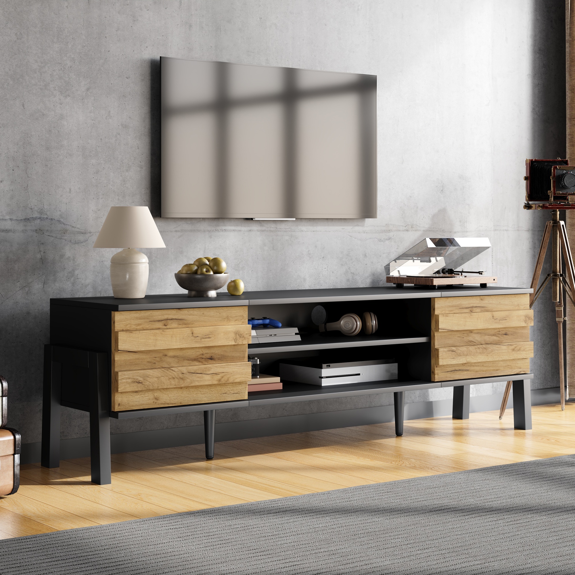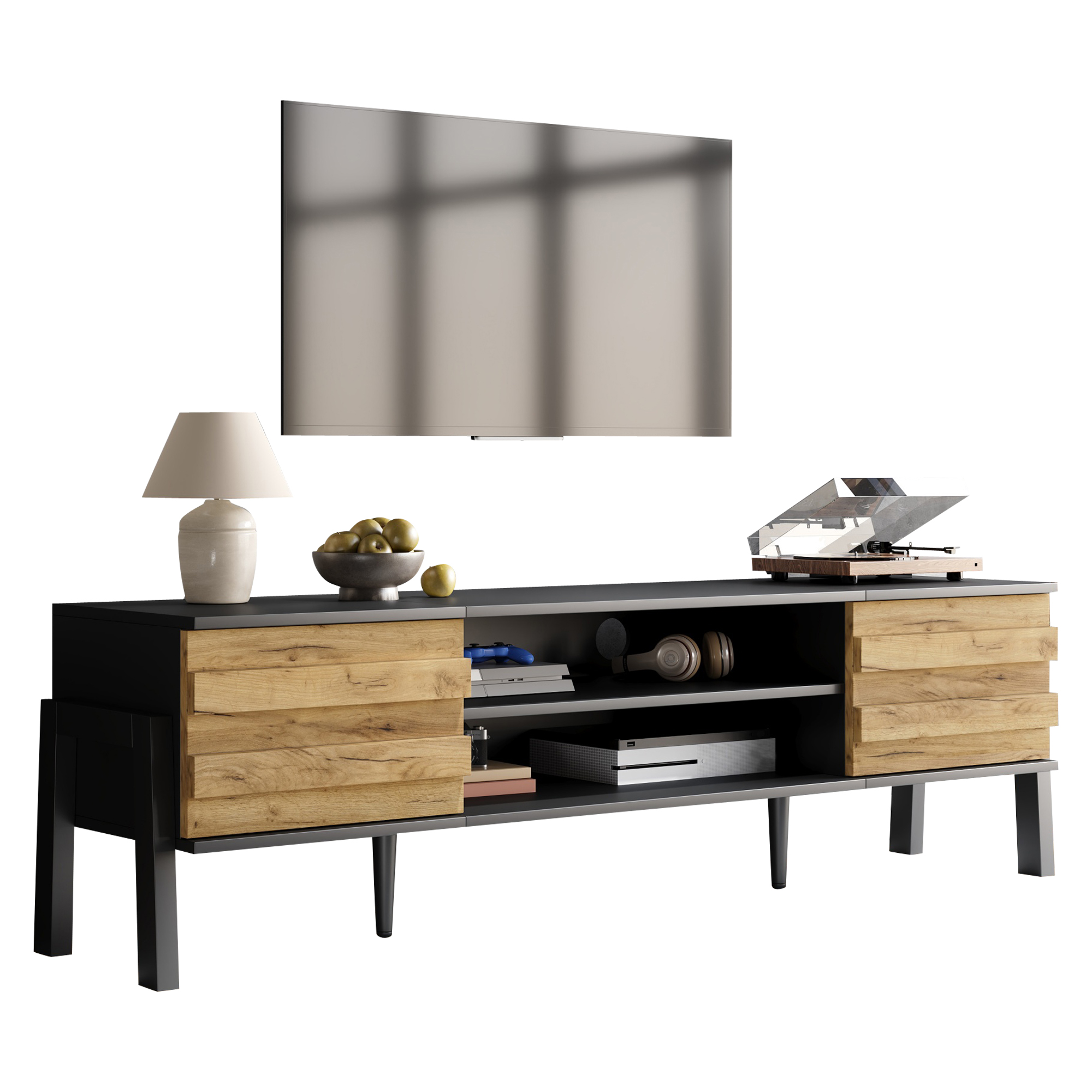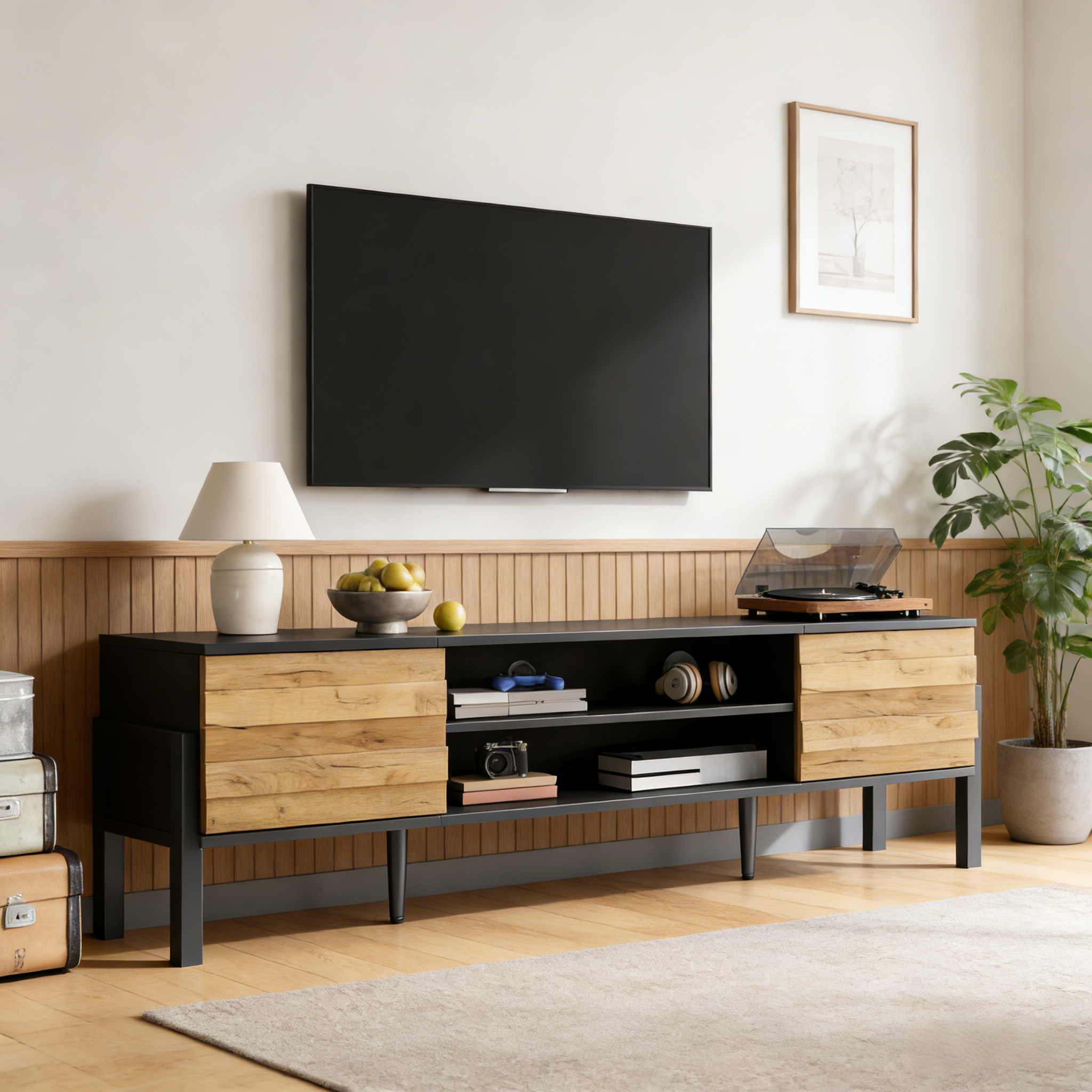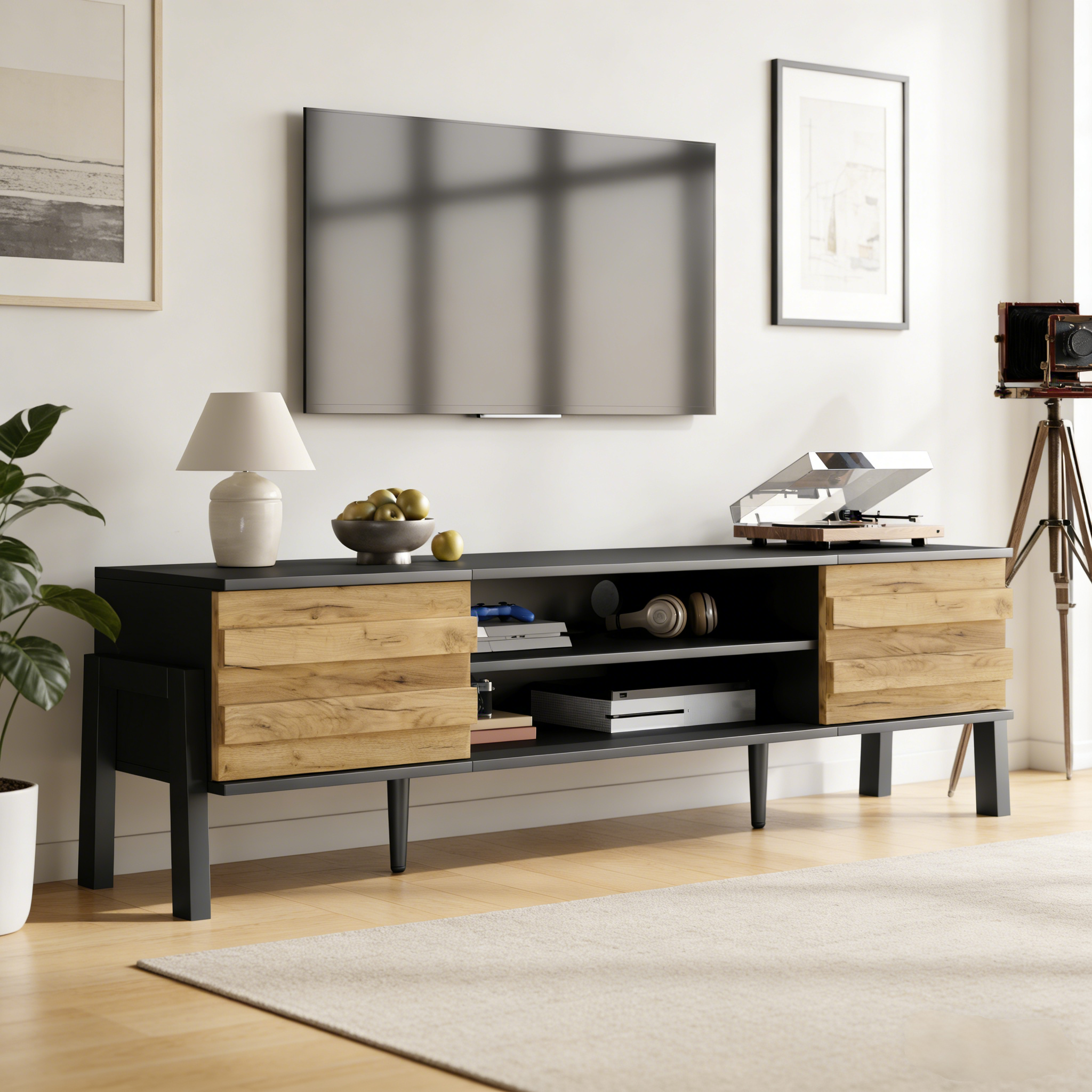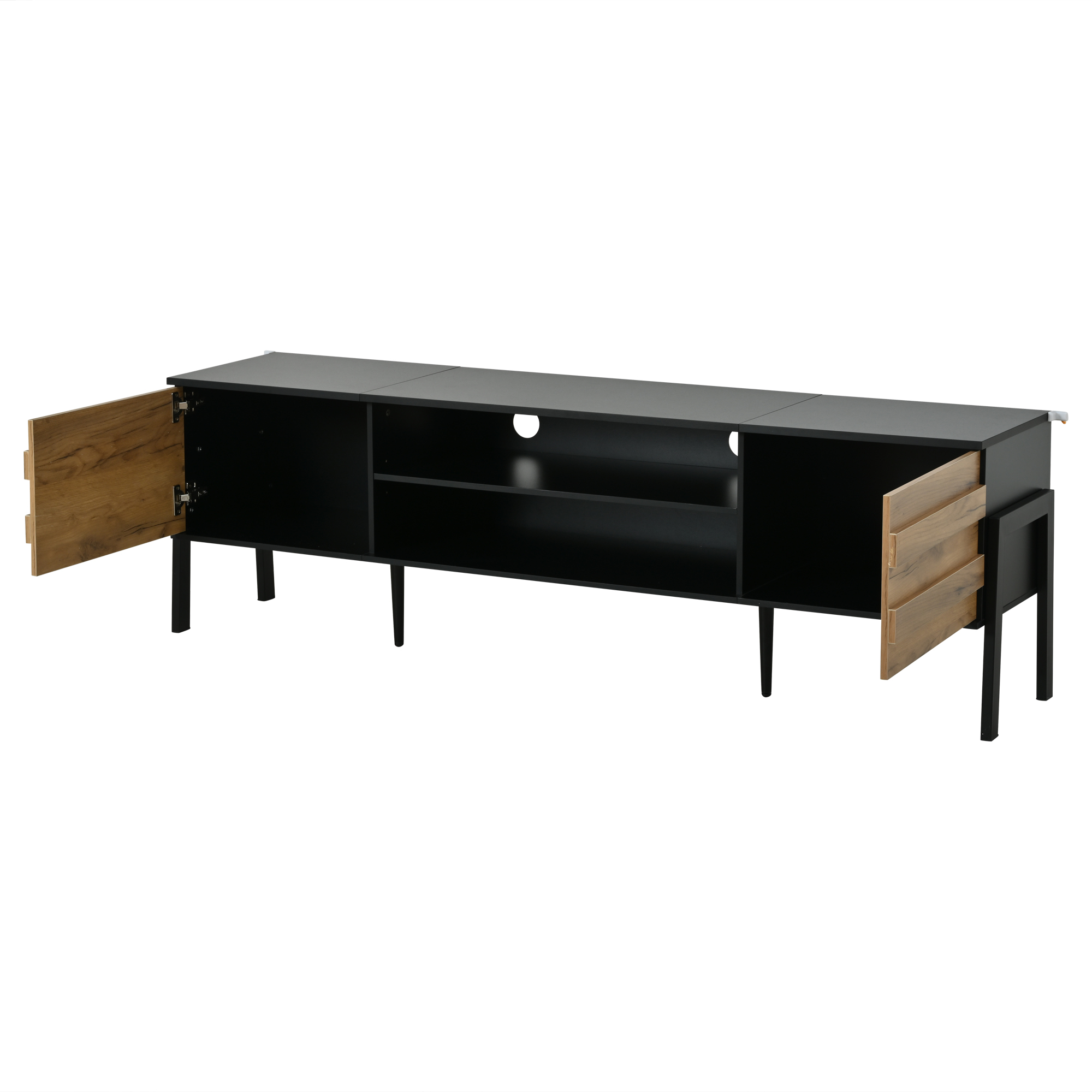 Product Name:175*39.5*53cm TV cabinet, TV board, TV console with 2 cabinets and open storage space, TV table, TV stand, living room cabinet, suitable for TVs up to 70 inches,Natural wood color + black