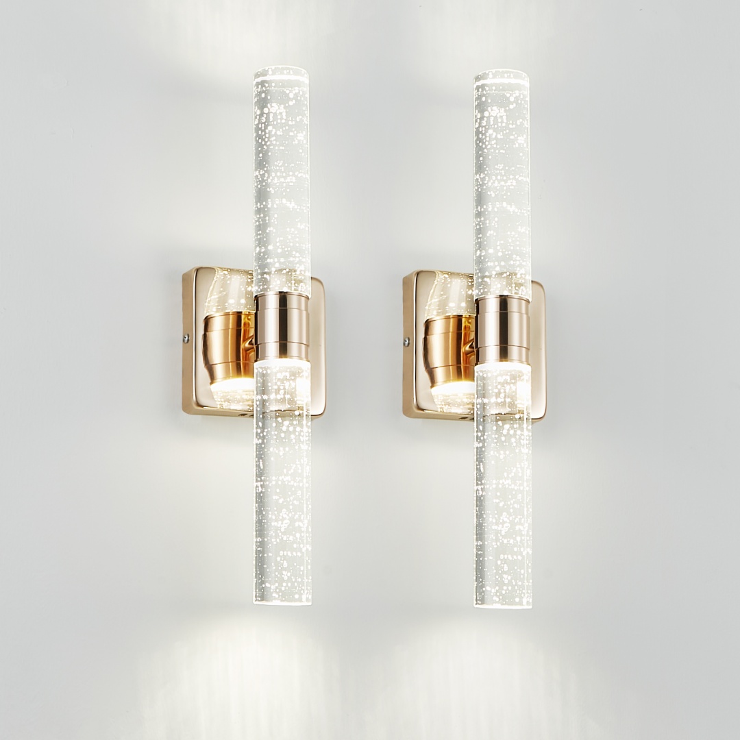Modern design: Minimalist crystal wall lamps with elegant bubble crystal tubes perfectly match the modern or minimalist home style to enhance the texture of the space.Double light source: The double lamp design provides more uniform and soft lighting, which is suitable for use in multiple indoor Spaces such as bathrooms, bedrooms, corridors and so on, increasing practicality.High-quality materials: The use of high-quality bubble crystal and durable gold-plated metal material, not only to ensure the beauty of the lamp, but also to increase its durability, long-term use is not easy to rust or fade.Crystal effect: After the lamp is lit, the bubble crystal refracts a bright light under the irradiation of the light, creating a visual effect similar to the aurora, adding a sense of luxury in the space.Easy to install: The lamp design is simple, with detailed installation instructions, users can easily install without professional skills.
