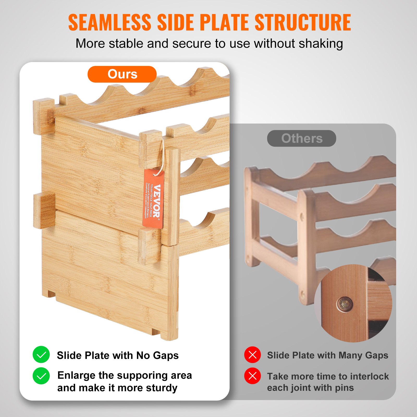 Sturdy Construction: Our wood wine rack is very sturdy, with upgraded side panels that eliminate gaps and expand the support area. This design ensures the rack's stability, preventing wobbling, tilting, or falling, and providing excellent safety for your bottles over long-term use.