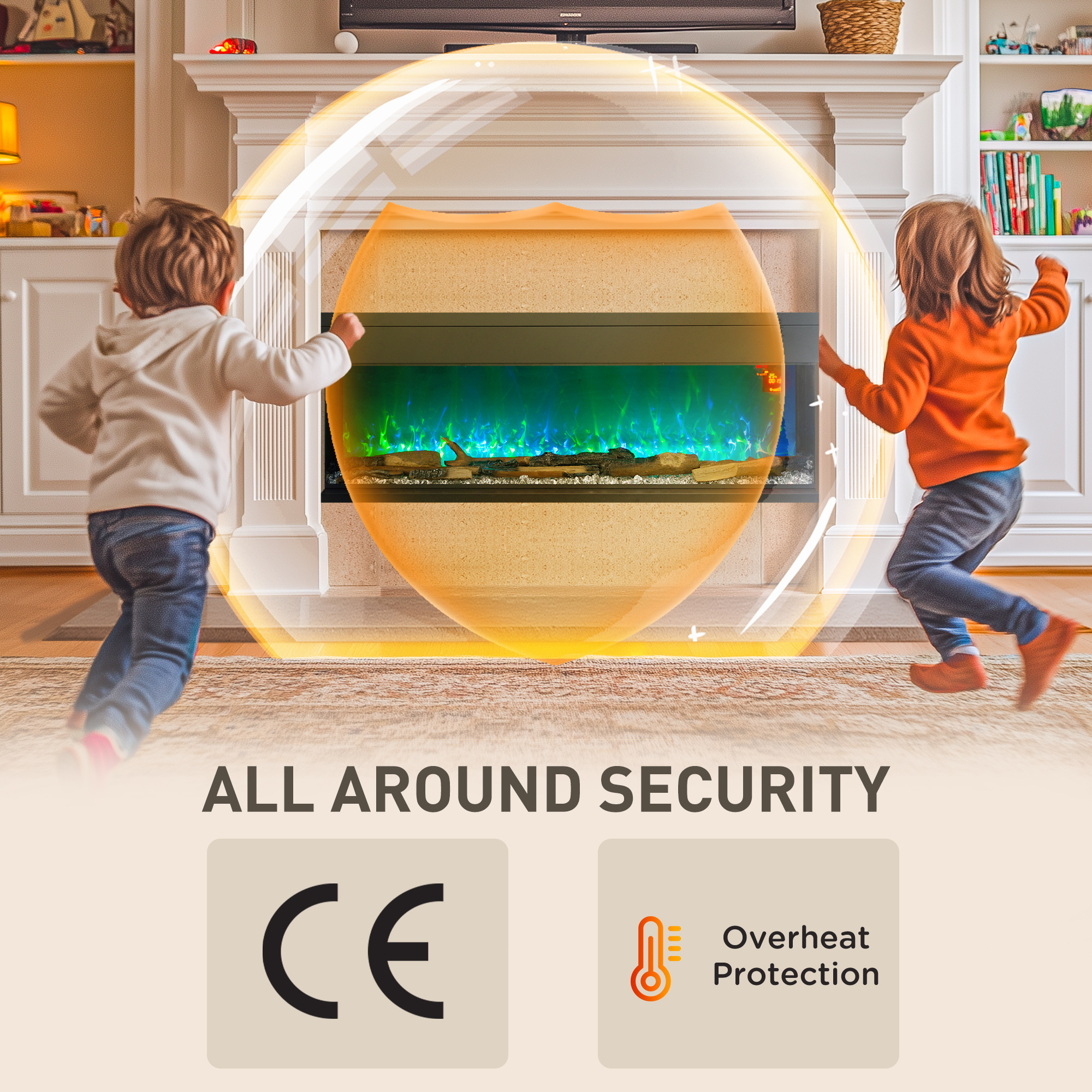 A beautiful piece to look at, which keeps you beautifully warm - this electric wall mount fireplace. It's fitted with a panoramic glass front panel, with a faux fire and logs inside—easily adjust the flame brightness and colour to set an ambience you desire. It can be a wall electric fire, recessed/inset electric fire, freestanding electric fire, or media wall fire.