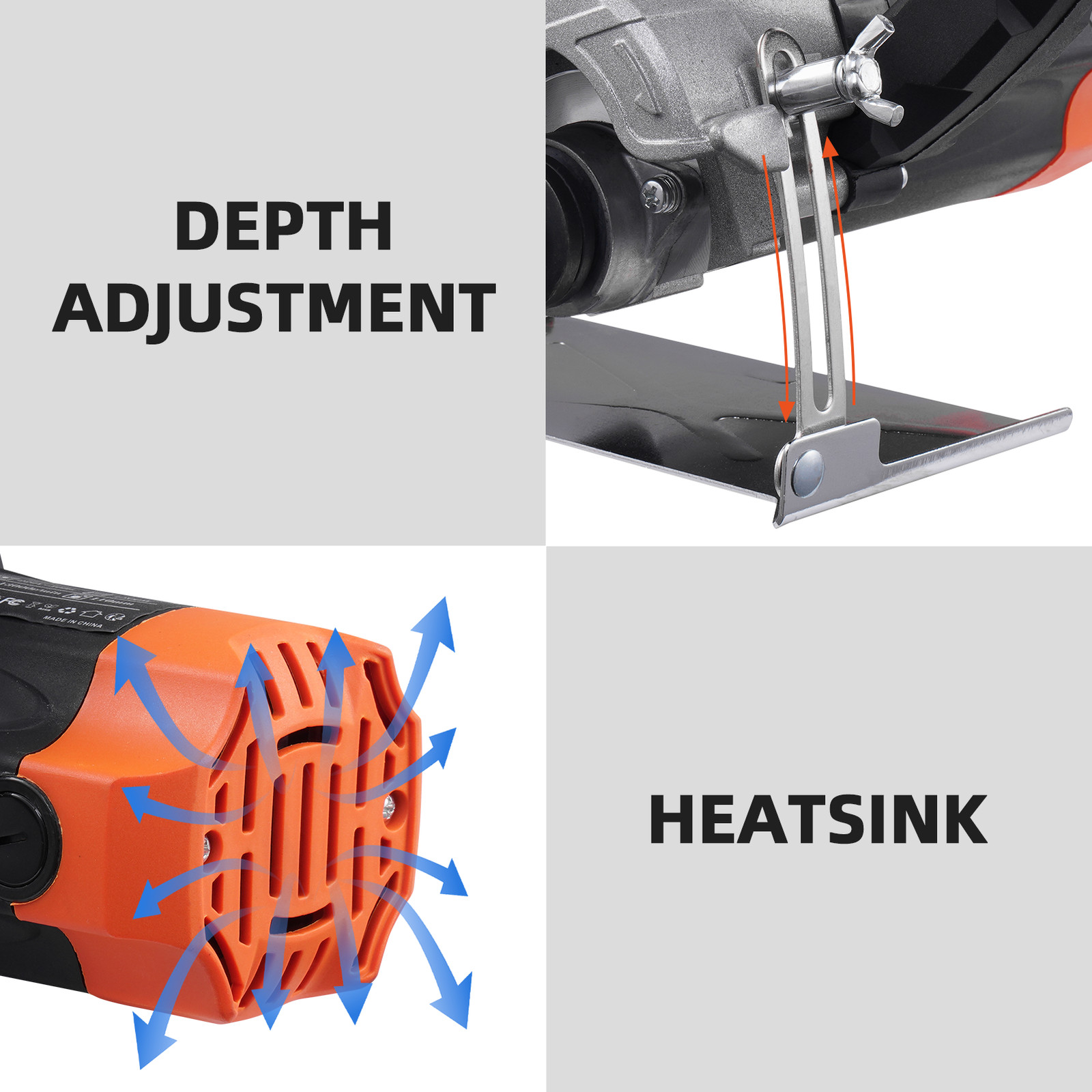 3.Efficient Motor: The 1800W motor is powerful and suitable for cutting wood, plastic, PVC and soft metals, with a speed of up to 12000 rpm. Suitable for cutting wood, soft metal and plastic. Equipped with a hexagonal wrench, it is convenient to replace the saw blade.