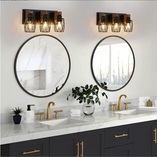 Product Name:18" Industrial Vintage 3-Light Wall Sconce - Black Cage Wall Lighting Fixture with Wooden Accents for Bathroom, Hallway, or Living Room (Bulb Not Included)