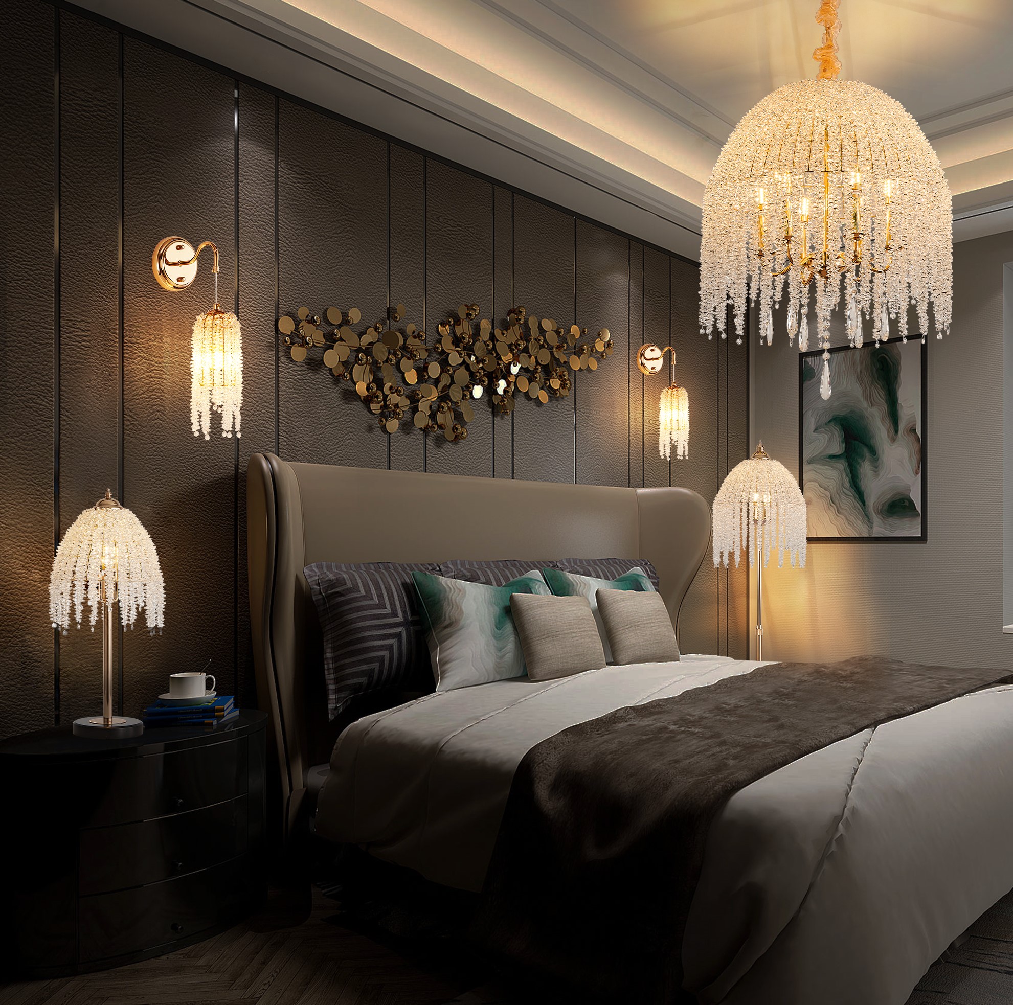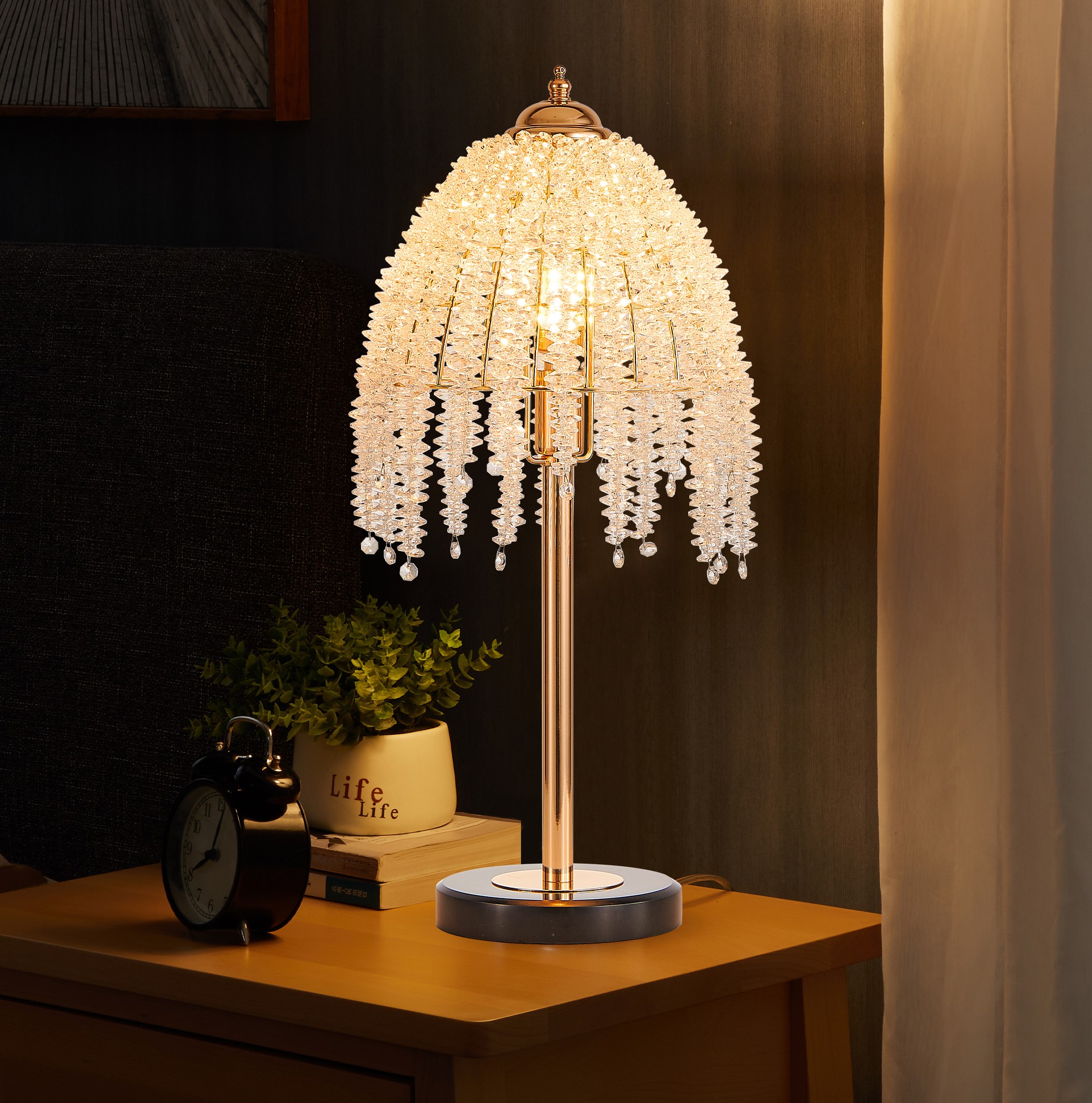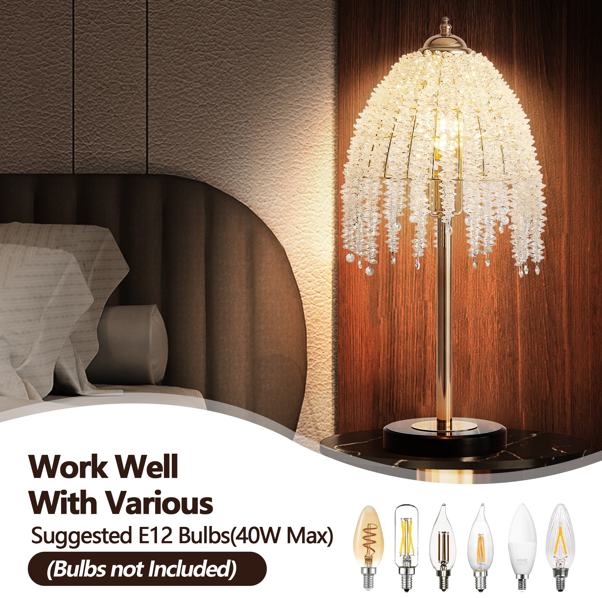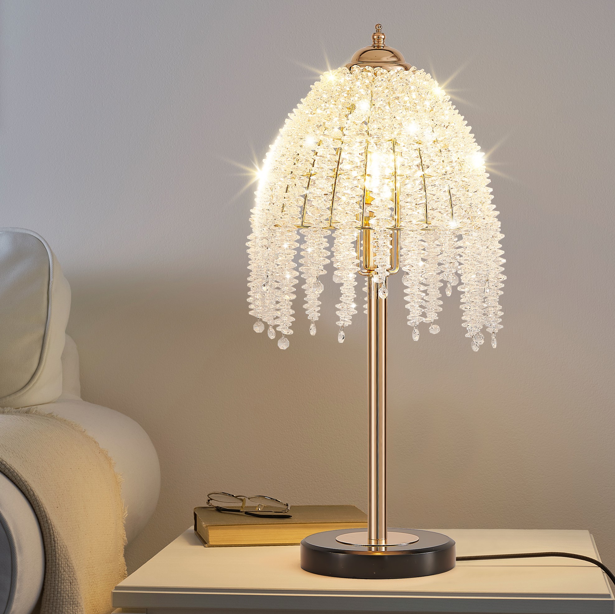 Exquisite Waterfall Design: The cascading crystal bead strings create a stunning waterfall effect, adding a luxurious and sophisticated touch to your space.Perfect Size for Any Space: This table lamp is compact yet impactful, fitting effortlessly on nightstands, desks, or side tables without taking up too much space.Versatile Style: Its vintage-inspired design with modern crystal accents complements both contemporary and classic décor, making it an ideal addition to living rooms, bedrooms, offices, or entryways.Durable and High-Quality Construction: Made with premium crystal and metal components, ensuring long-lasting durability and a timeless, elegant look that won't easily go out of style.Easy to Use: Equipped with a simple on/off switch, this lamp is easy to control, making it convenient for daily use.