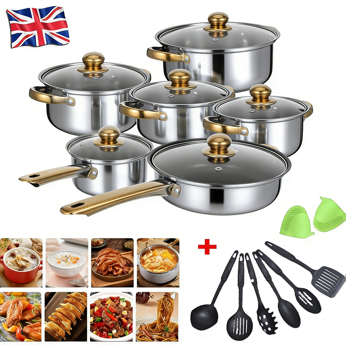 19 PCScookware set, including a non-stick saucepan, frying pan, and milk pan