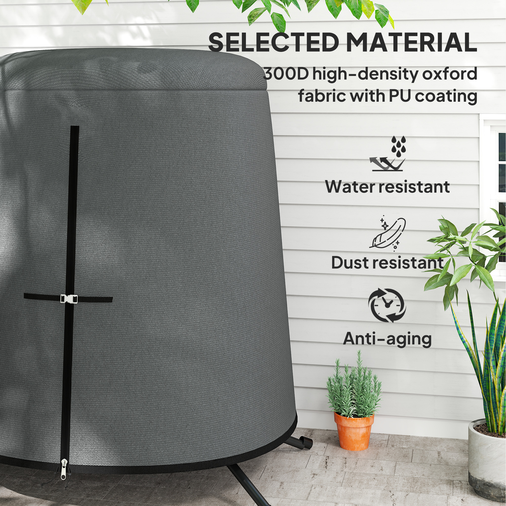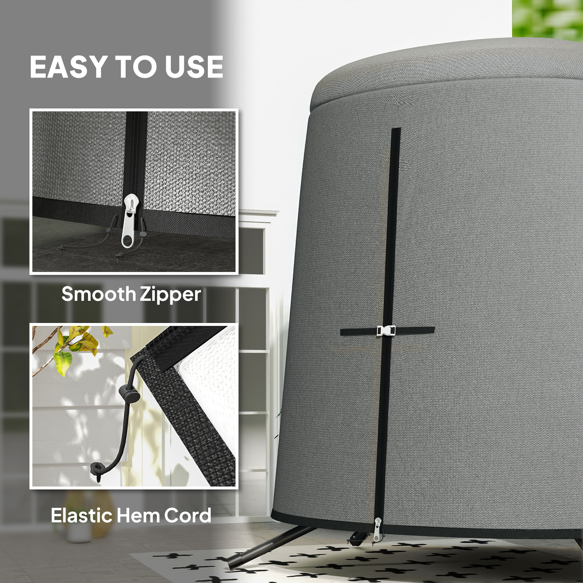 Protect your egg chair with this cover. Made from Oxford fabric, it is a robust piece, with a plastic coating to create a weather-resistant top layer: protects against sun, rain, wind and dirt. The zip fastening makes it easy to put on and remove, with a pull cord fastening for a tight and secure fit.