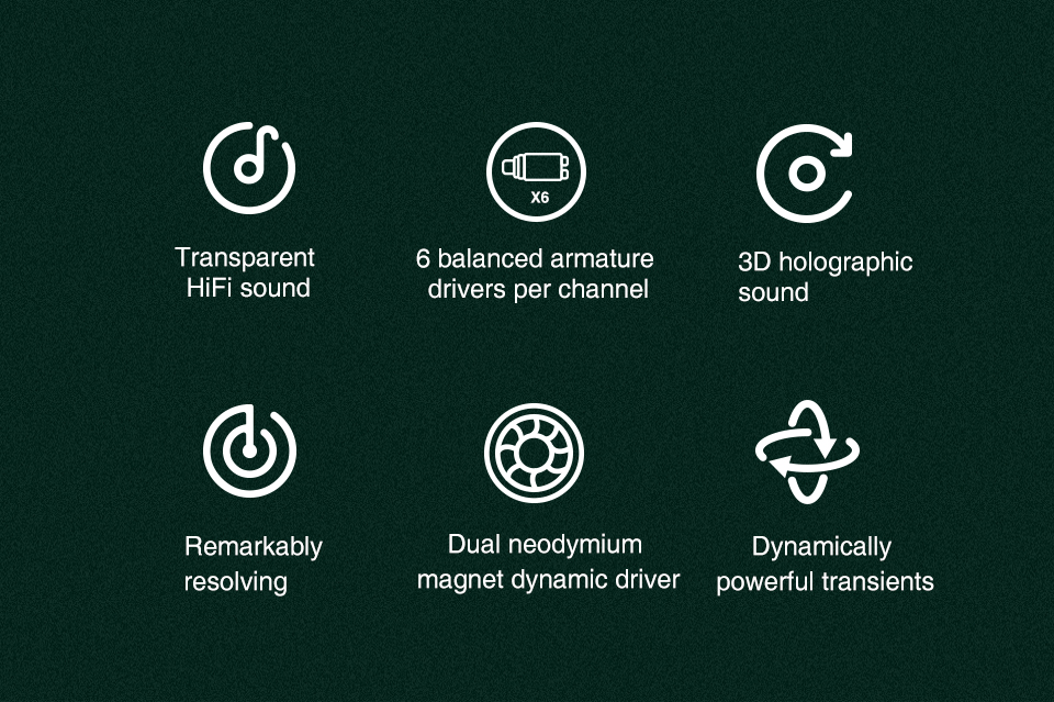 15.Driver unit: 6BA+1DD hybrid driver unit (Super-sized 10mm Diaphragm + Customed BA )