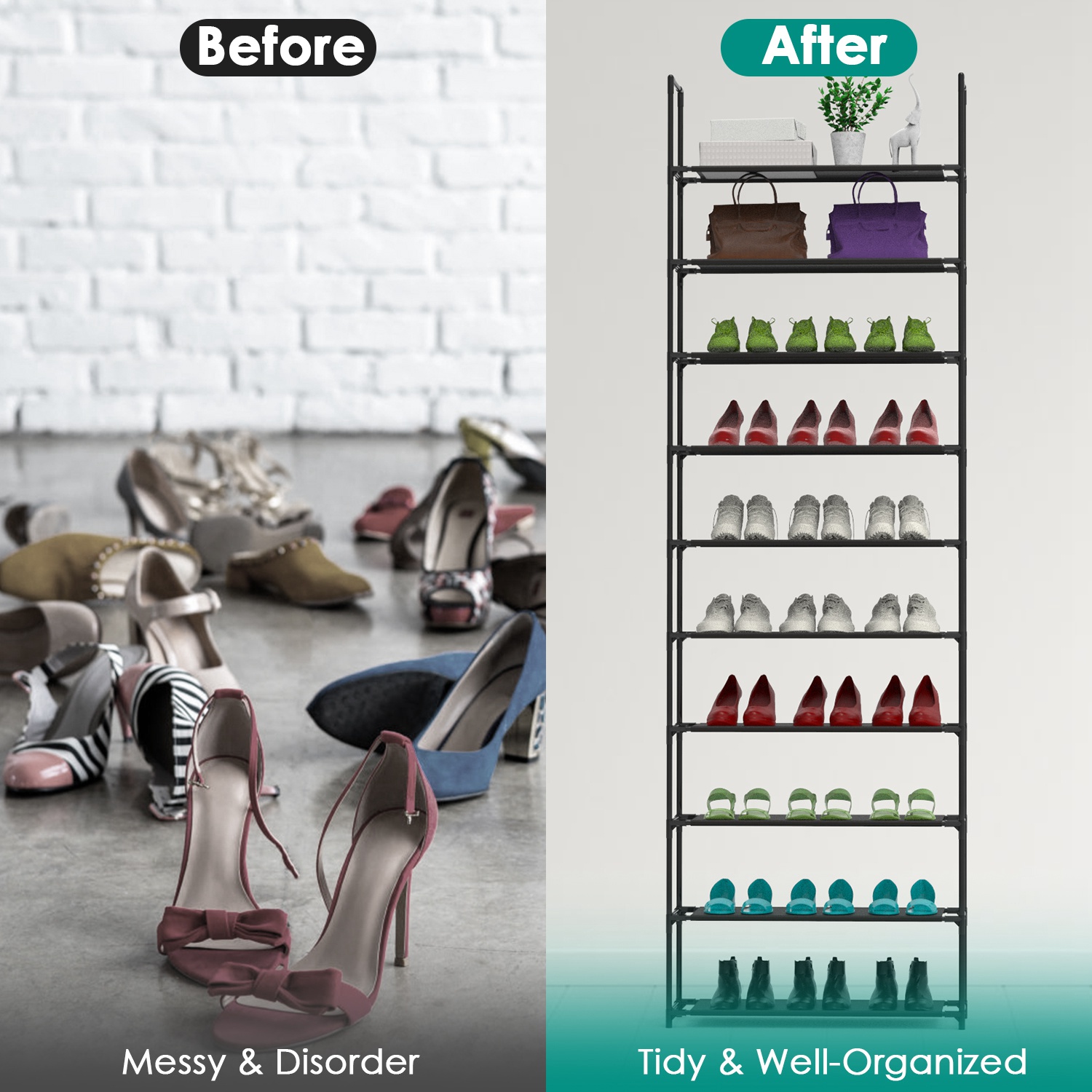 *Space Saving Shoe Rack*:This 10-tier tall shoe rack measuring 23.03x10.82x72.83in,making full use of your vertical space,is an easy and affordable choice to store your various kinds of shoes. A large and stable rack helps you to keep the entryway,closet,hallway,living room and bedroom away from mess.