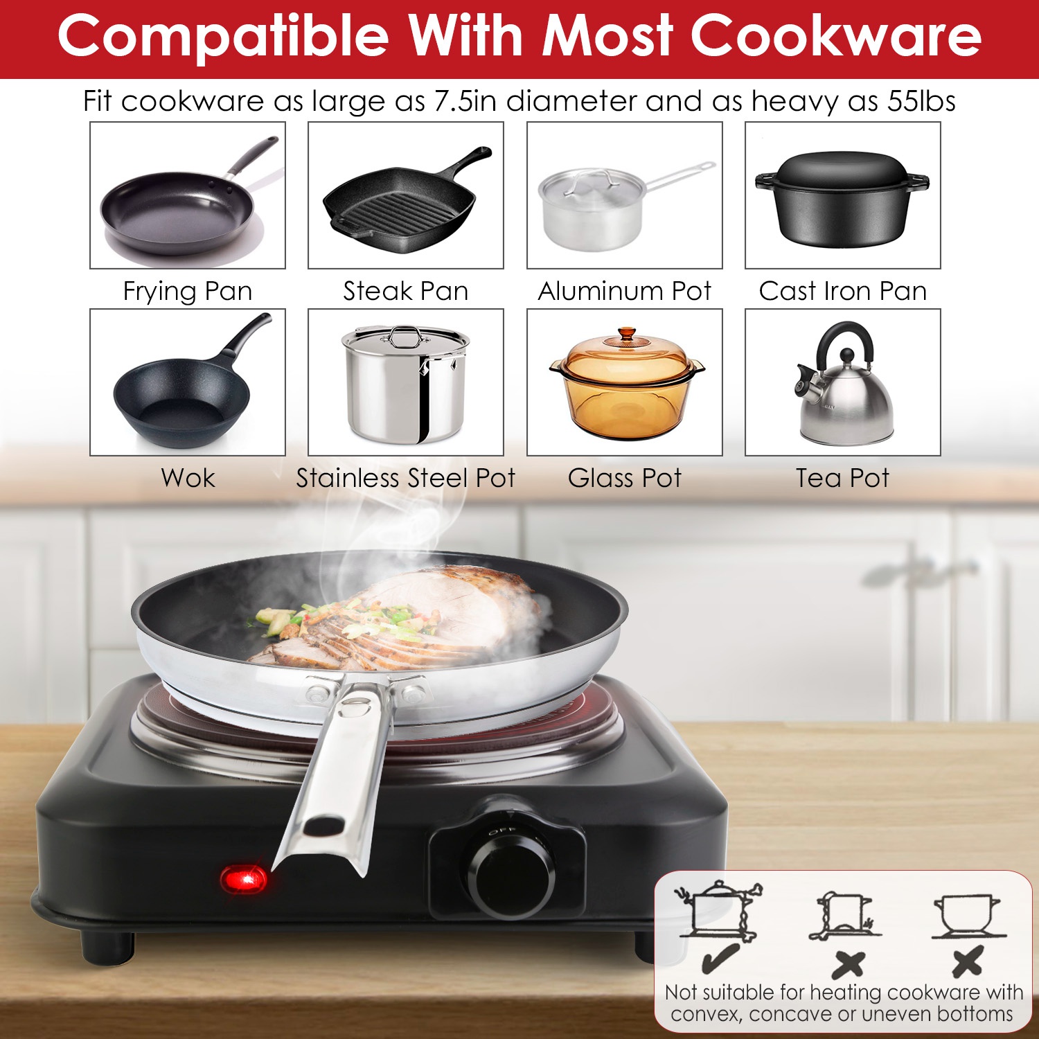 • *Wide Compatibility*:The burner can be used with any flat-bottomed cookware made of a variety of materials,such as frying pans,woks or stovetop teapots made from aluminum,stainless steel,iron,copper,ceramic or glass. Recommend to use the cookware with diameter ≤7.5in. Note:May heat ceramic pot very slowly.