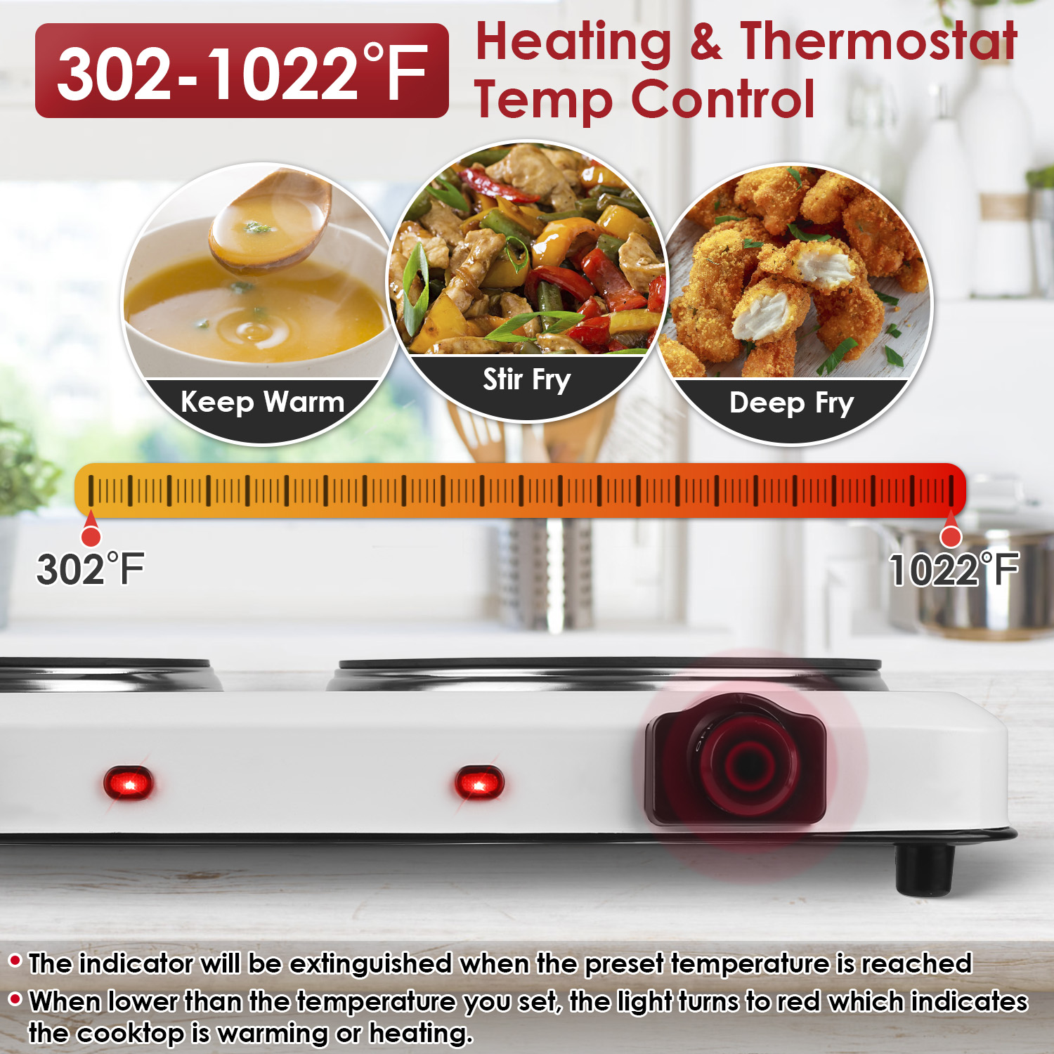 *Stepless Heating Temperature*:With stepless heating temperature adjustment from 302℉ to 1022℉,easily meet your daily cooking needs,such as boiling water,reheating sauces,making soups,frying steak,cooking pasta,grilling cheese and vegetables,etc.. Knob control and indicator light allows for convenient operation.