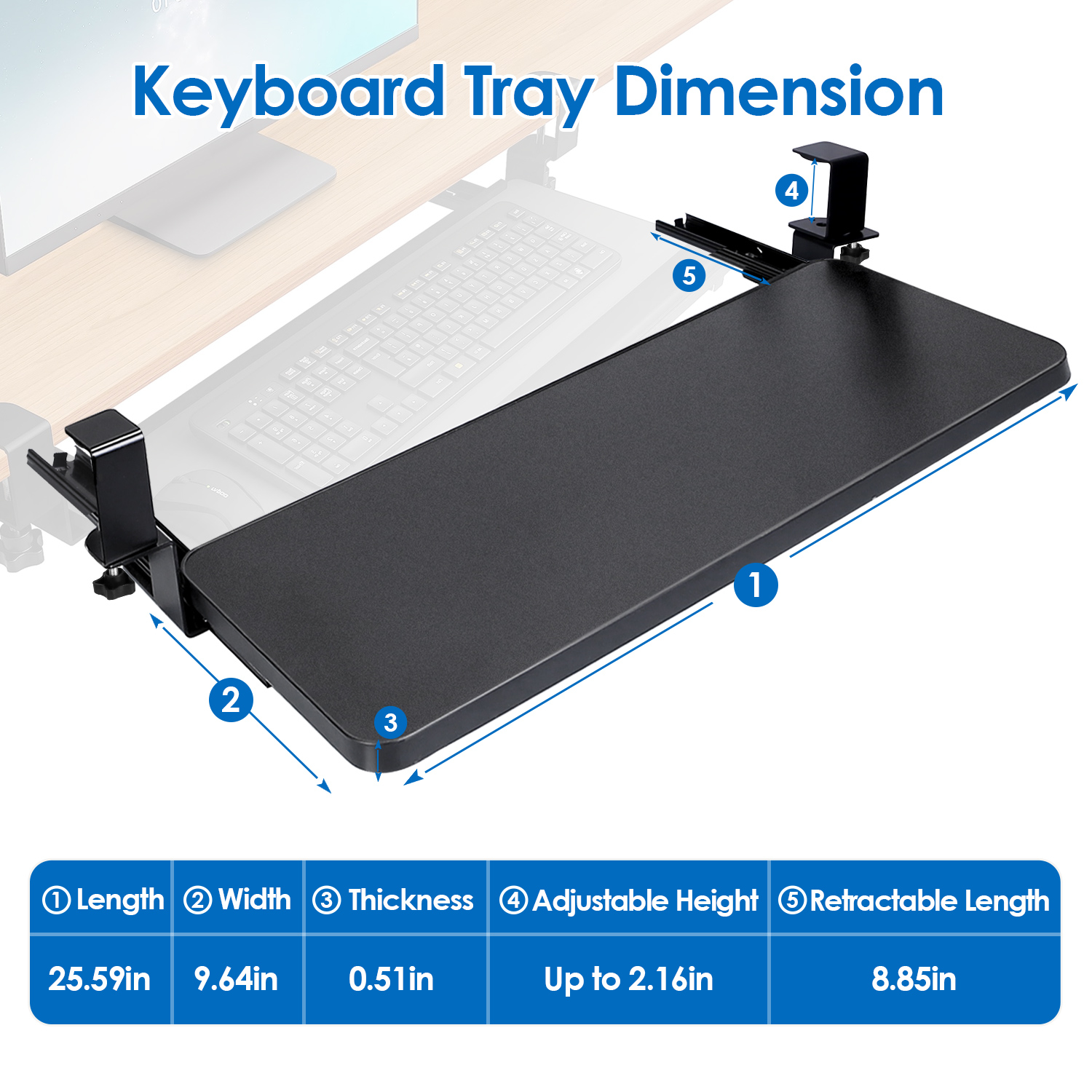 *Adjustable Height*:Capable to be adjusted up to 2.16in,you can freely modify our keyboard tray according to various desk’s thickness. Besides,you can also rotate the rotary clamp to diverse angles,meaning that our keyboard tray can be used for different types of desks.