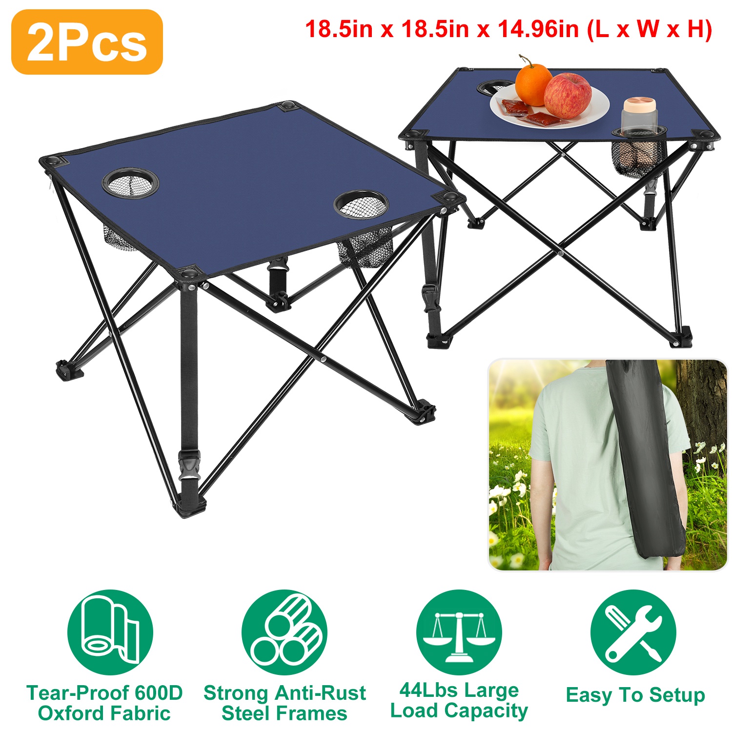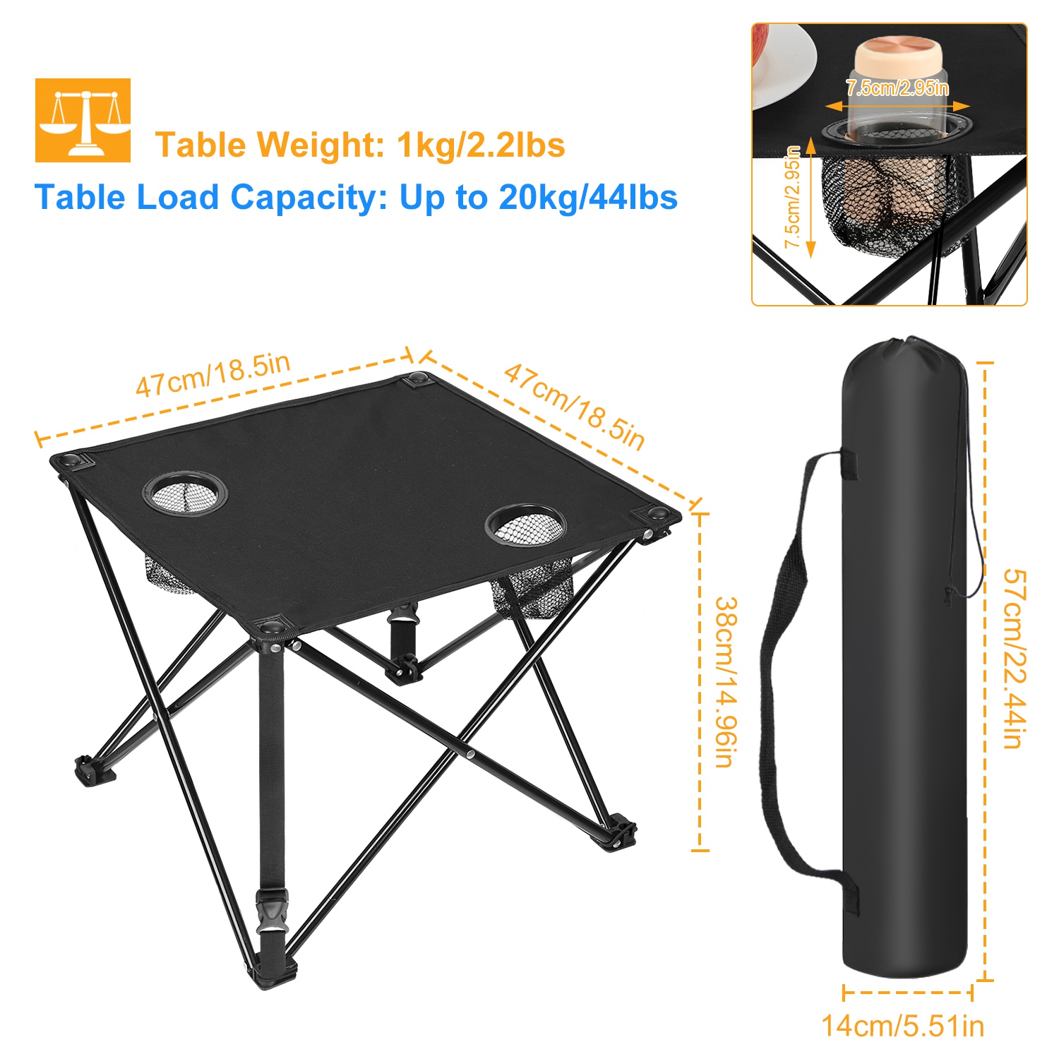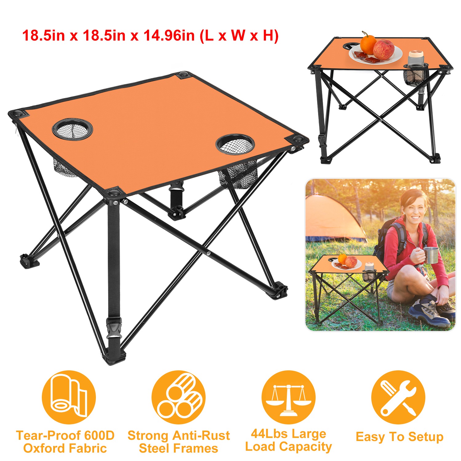 *PORTABLE FOLDING TABLE*:Designed with a foldable structure,this 18.5 in x 18.5 in x 14.96 in(L x W x H) square table packs down neatly into a compact 22.44 in x 5.51 in storage bag(with handle). Weighing only 2.2 lbs,it’s easy to carry and won’t weigh you down,making it ideal for camping,travel,and outdoor activities.
