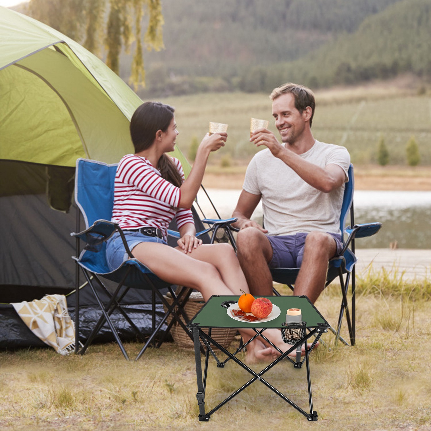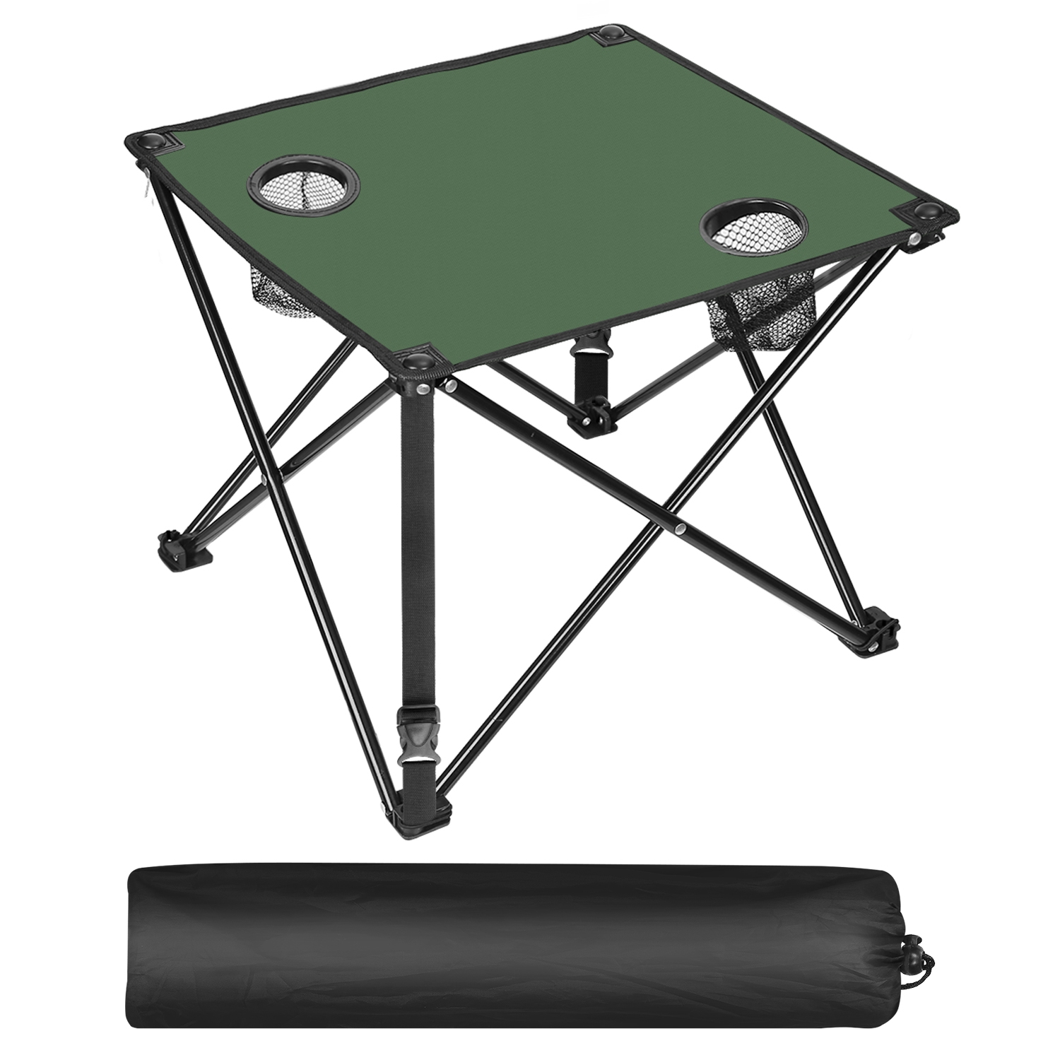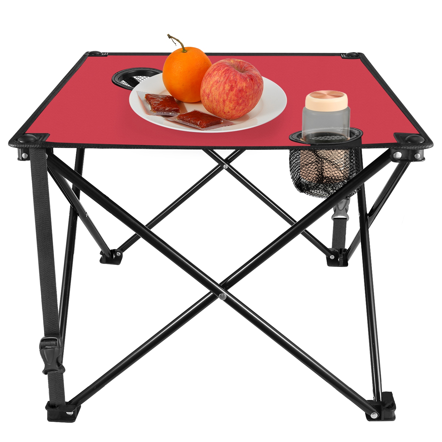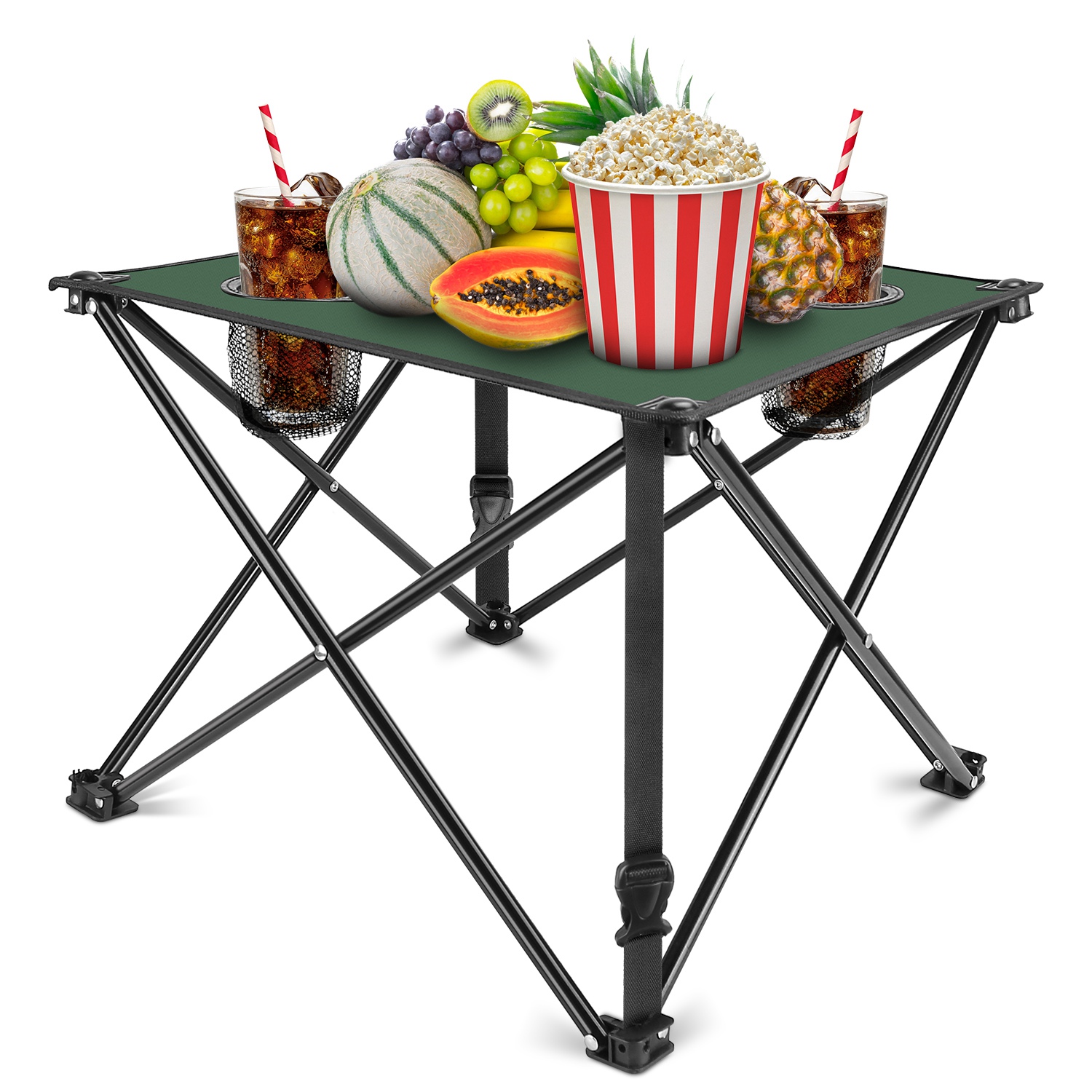*CONSIDERATE CUP HOLDER DESIGN*:Equipped with two integrated cup holders(2.95in diameter) featuring mesh pockets,the table provides dedicated spaces for beer bottles,beverage bottles,water bottles,and more,helping keep drinks secure and within reach.