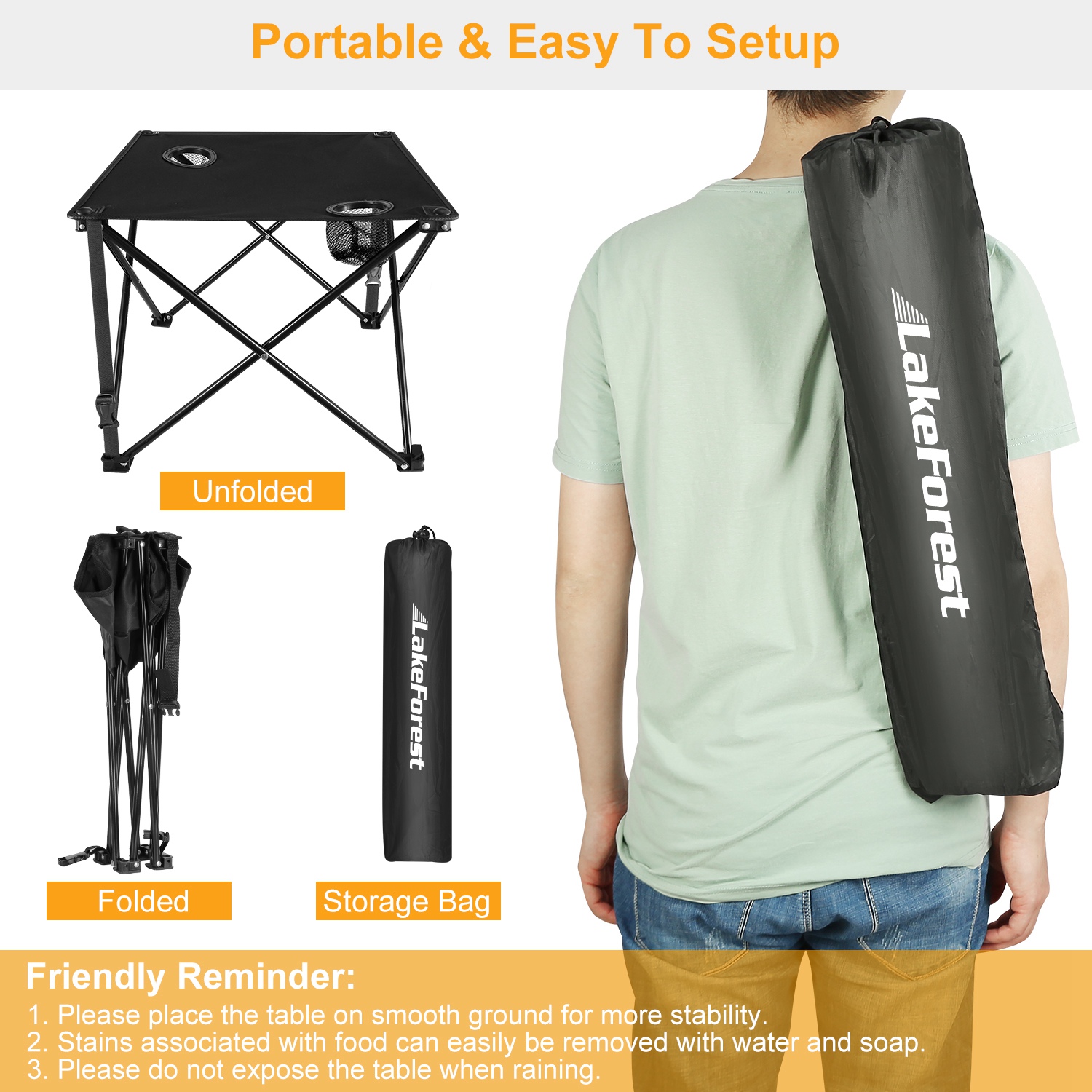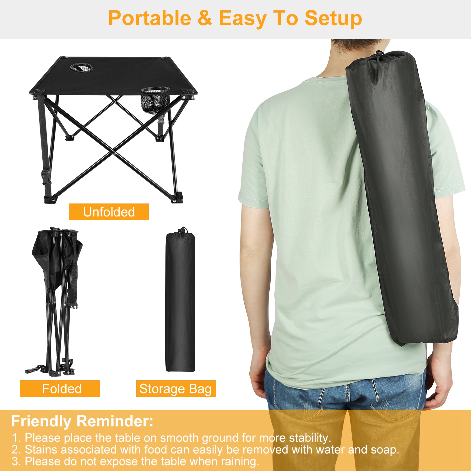 *STURDY & RIGID TABLETOP*:The tabletop is crafted from thickened 600D Oxford fabric that is tear-resistant,scratch-resistant,abrasion-resistant,and stain-resistant. A waterproof PVC coating on the underside helps prevent water penetration,keeping your items protected in outdoor conditions.