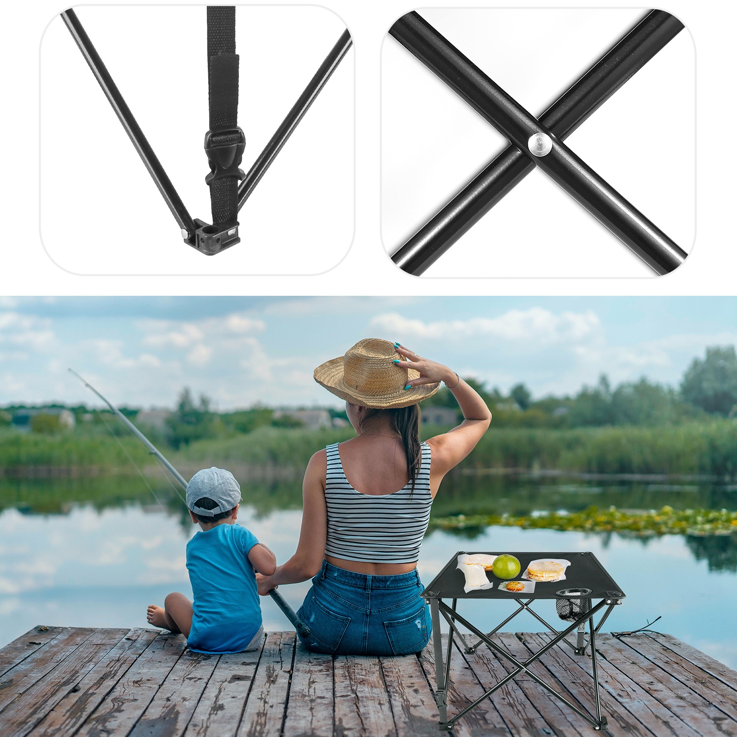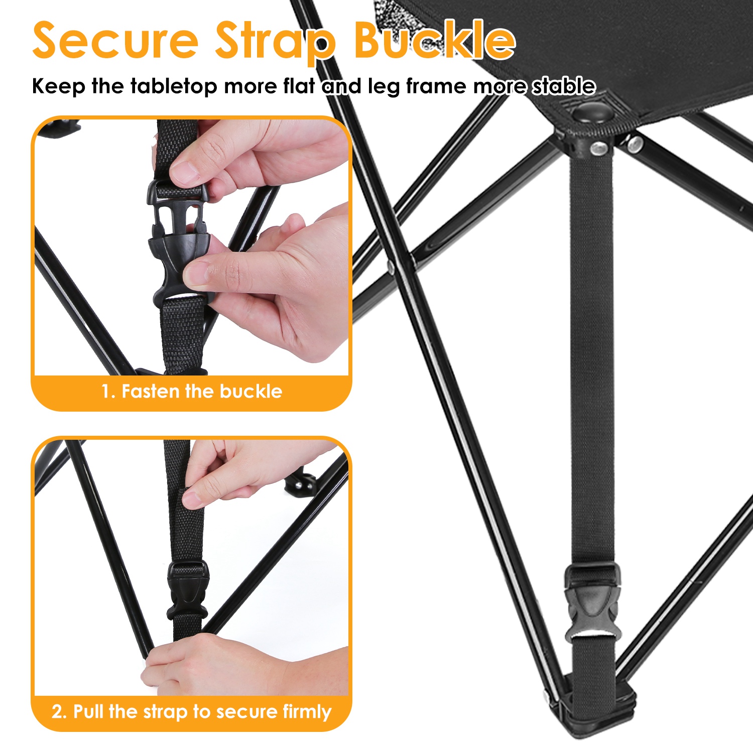 *EASY TO SET UP*:No tools required. The Oxford fabric tabletop comes pre-attached to the frame to save assembly time. Simply unfold the table and fasten the two reinforced adjustable buckle straps to lock the frame securely in place,and it’s ready to use in seconds.