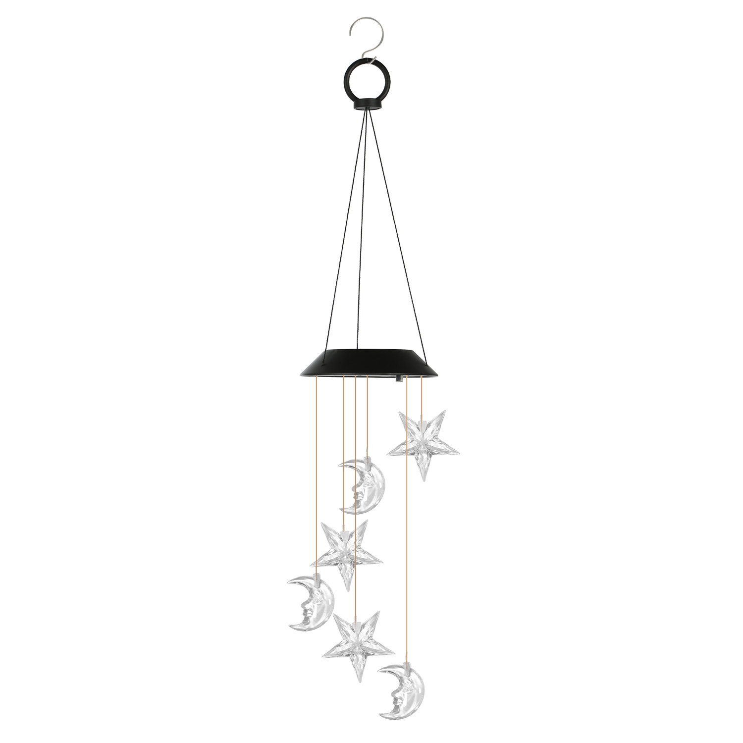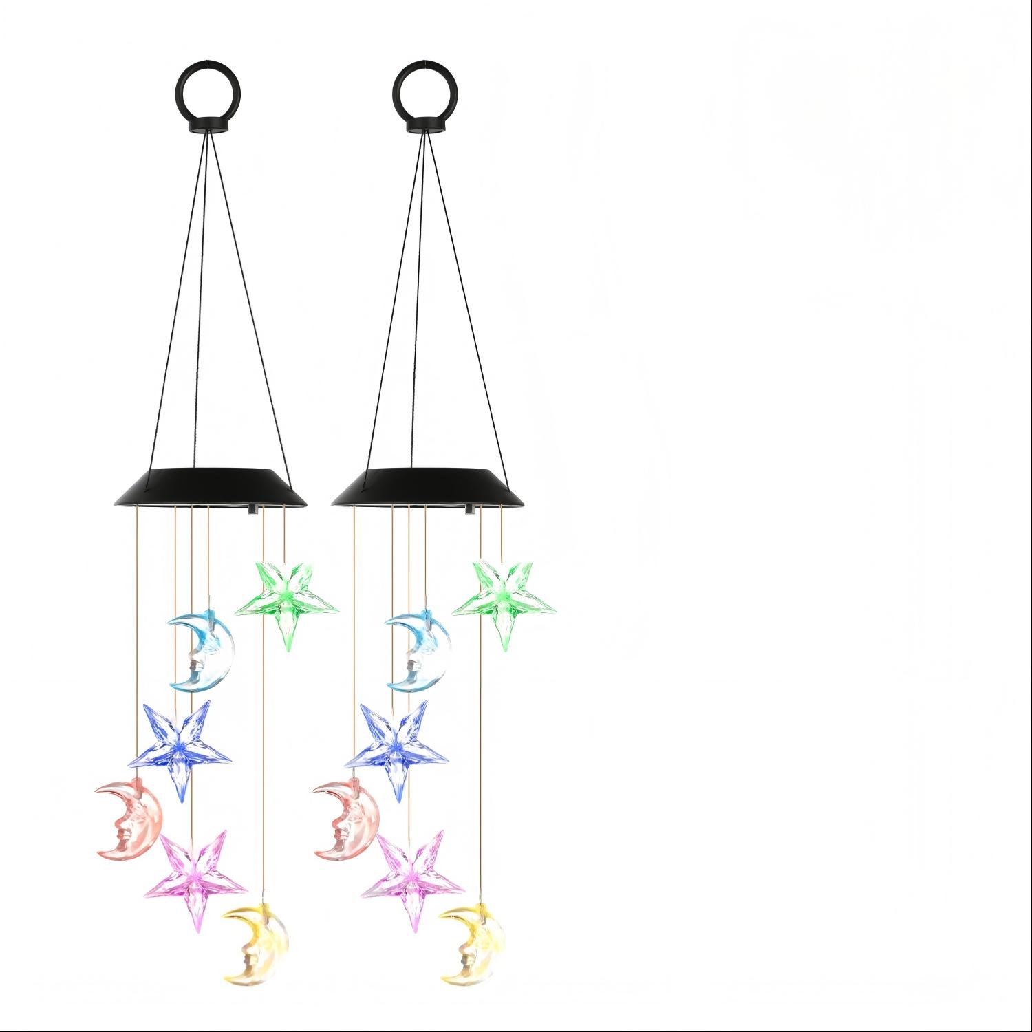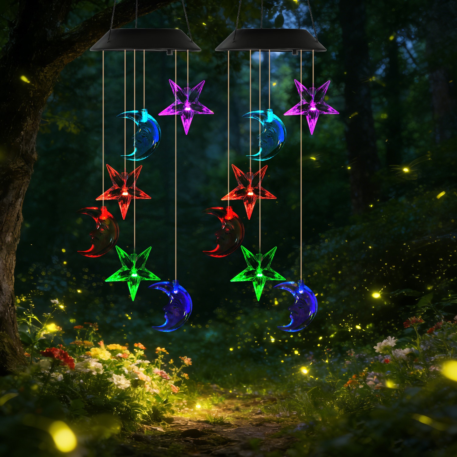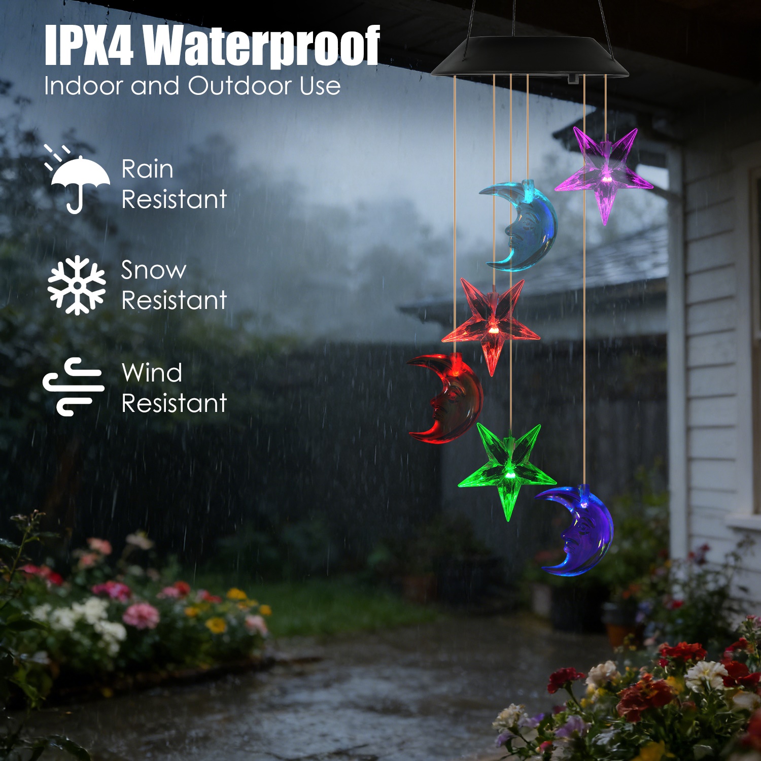 *Elegant Outdoor & Indoor Decoration*:Easy to hang. Beautiful even during the day,this moon and star solar wind chime adds artistic charm and refined elegance to gardens,lawns,balconies,patios,windows,and home interiors.