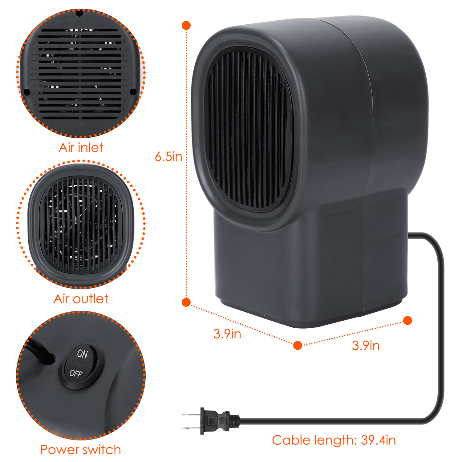 *Portable*:Dimensions:6.5x3.9x3.9in. You can carry this compact unit from room to room and enjoy customized heating anywhere!It comes in one piece and often fits on a table top,ideal for small areas like bathrooms,kitchen,basement,garage,and so on.