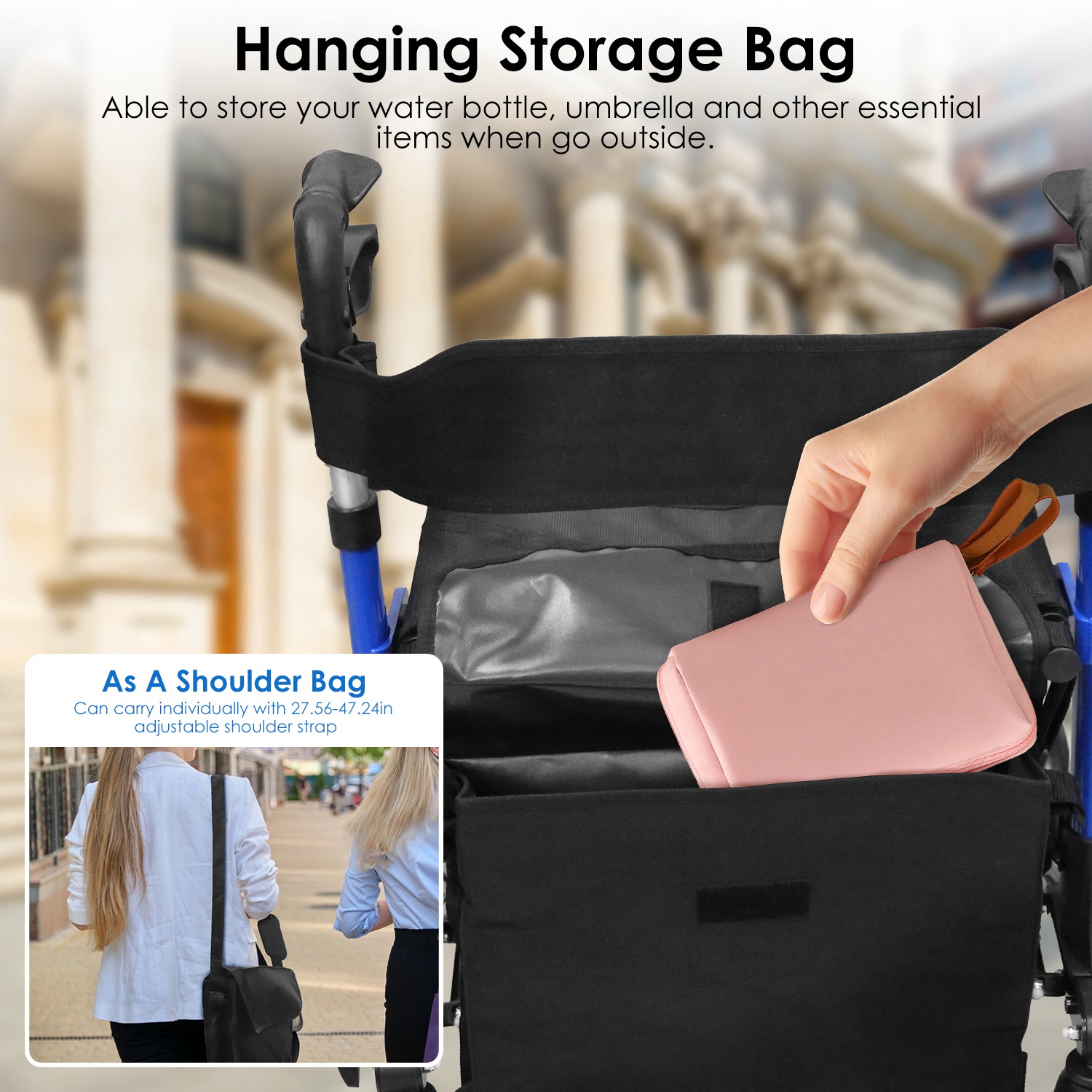 *Convenient Storage Bag*:Comes with a storage bag with size of 16.14x3.94x12.2in so that you can hang it on the rolling walker to store your water bottle,umbrella,books,magazines and other items you need when go outside. Besides,the bag is equipped with a length-adjustable shoulder strap,allowing you to carry it individually if needed.