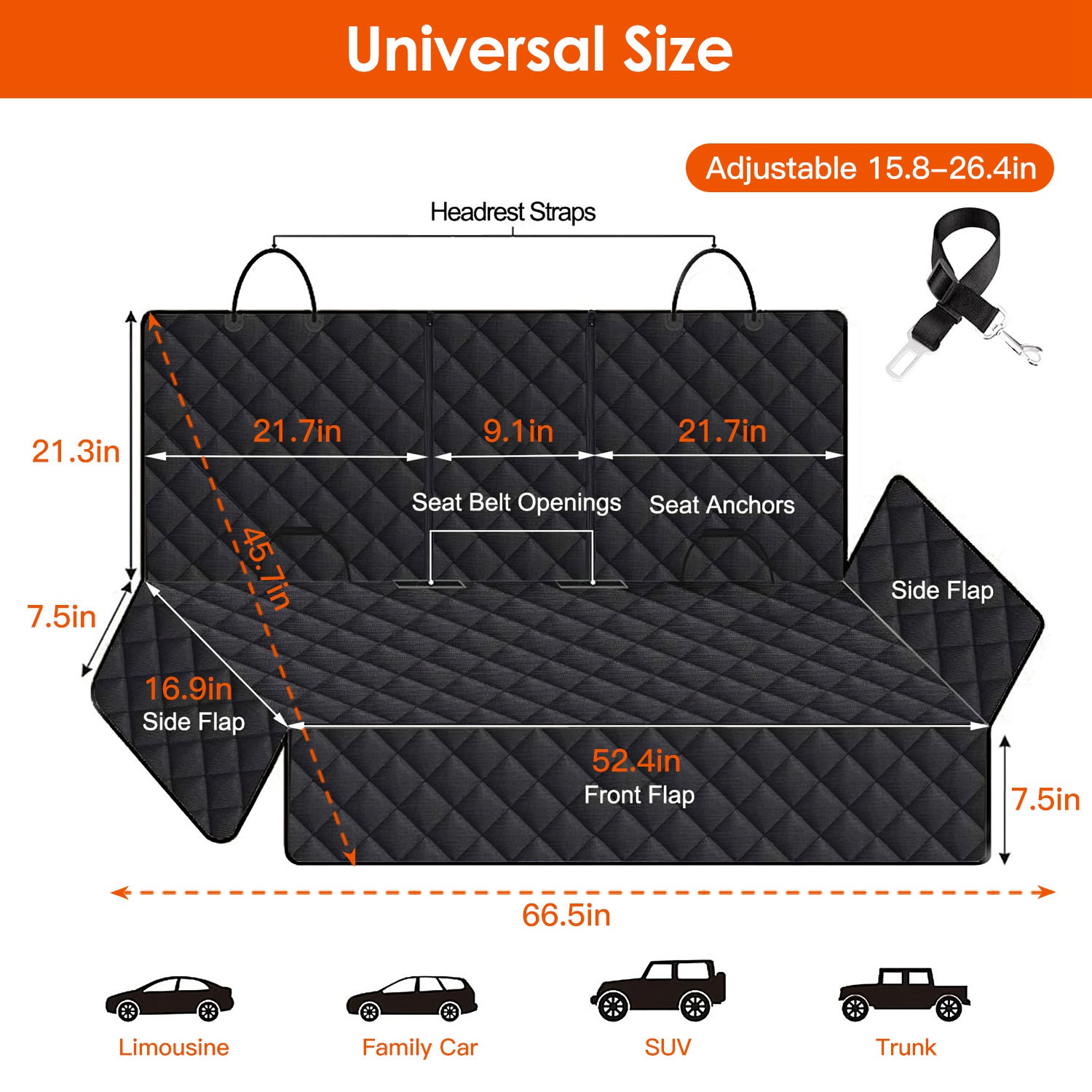 *Universal Fit*:Designed to fit for various vehicle types like most cars,SUVs,trucks etc.. Suitable for your beloved dogs,cats etc.. It provides a snug and secure fit,ensuring that your pet stays safe and comfortable throughout the ride.