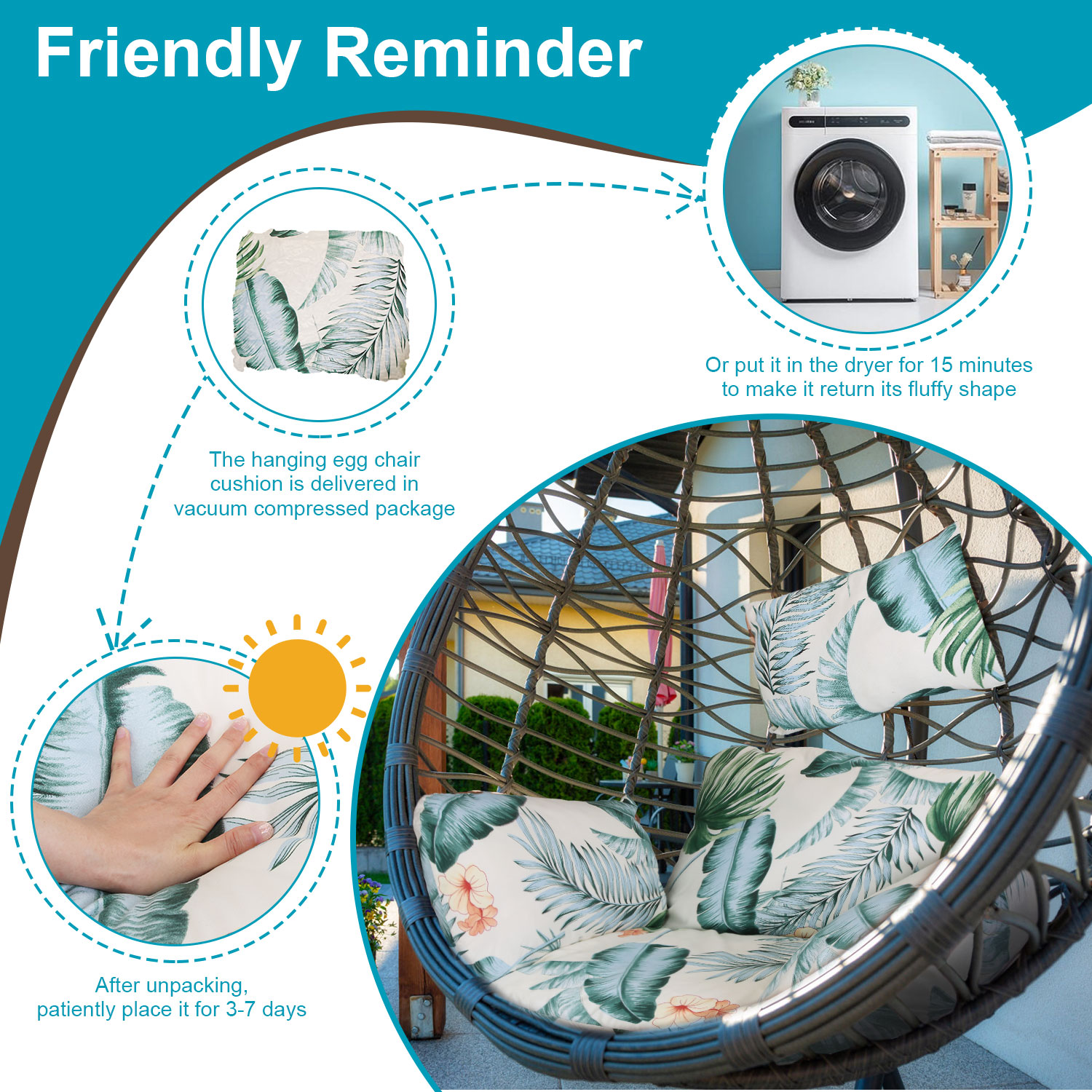 • *Friendly Reminder*:The hanging egg chair cushion is delivered in vacuum compressed package. After unpacking,please patiently place it for 3-7 days,or put it in the dryer for 15 minutes to make it return its fluffy shape.