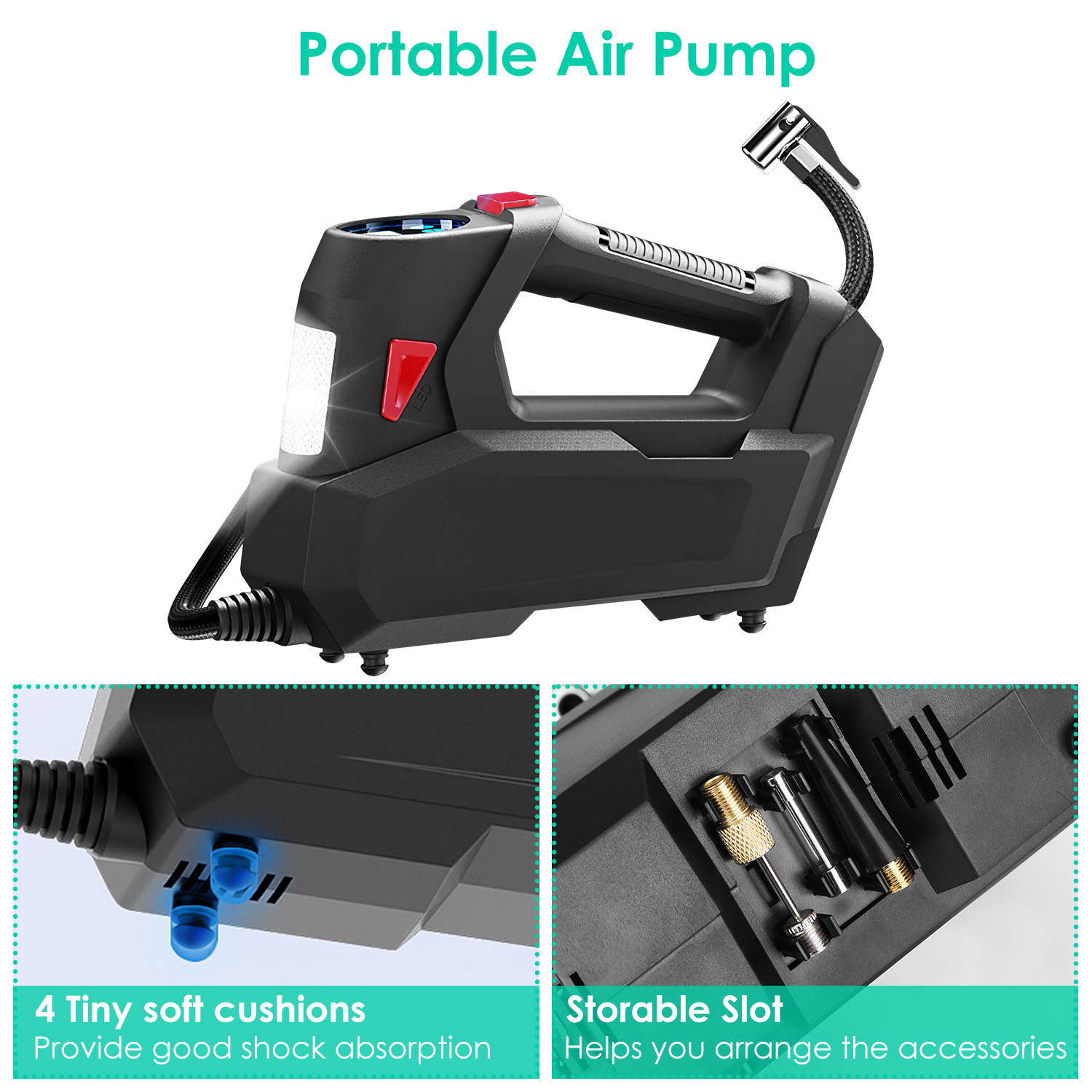 *Portable Air Pump*:This air compressor features a storable design at the bottom. It helps you arrange the accessories,such as inflatable nozzle for bicycle,fuse,inflatable needle for ball etc.. The air pump also comes with 4 tiny soft cushions,which provides good shock absorption.