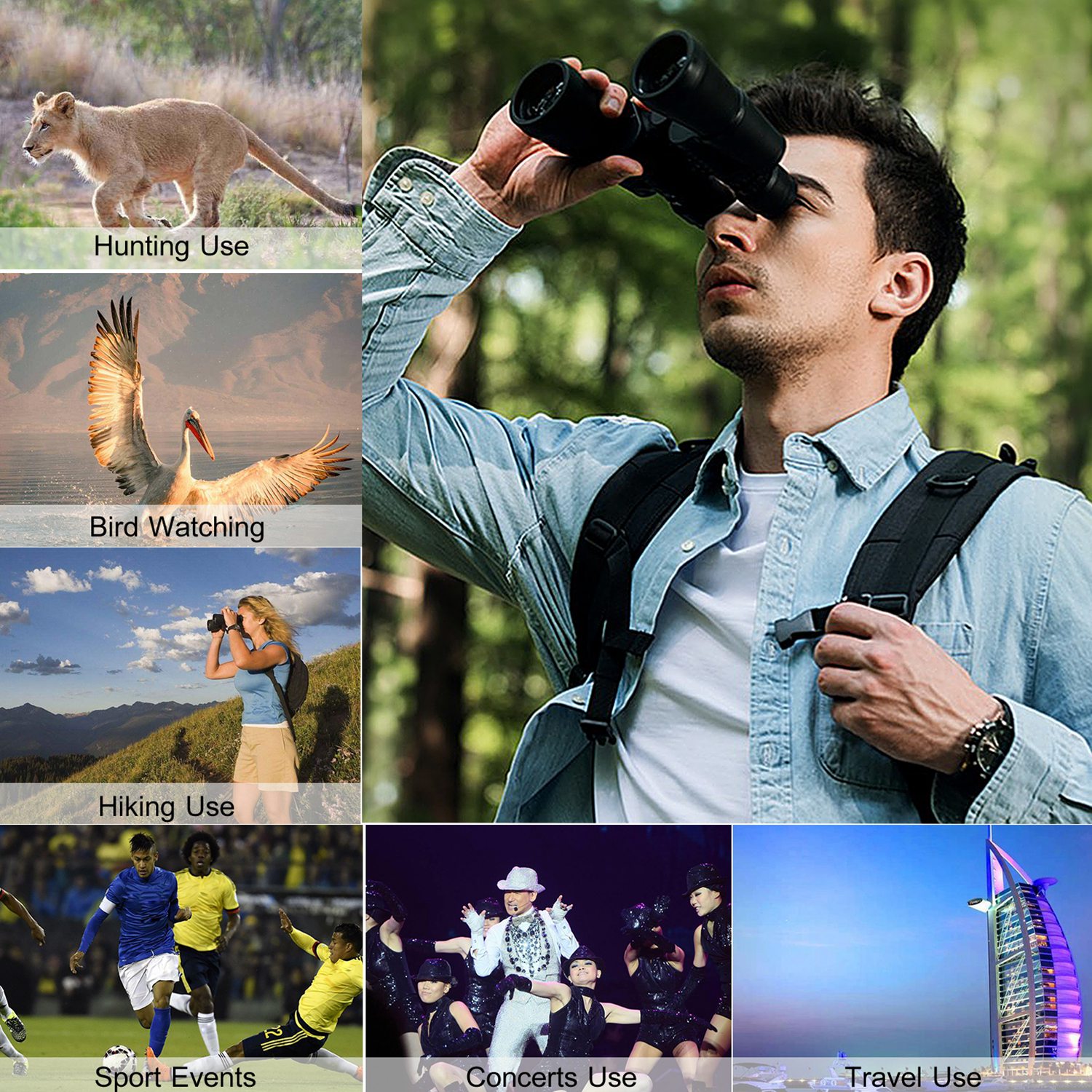 • *Large Field of View*:Our binocular adopts high-grade BAK-4 prisms. With a large field of view(268Ft / 1,000Yds),it is optimal for watching fast-moving things.