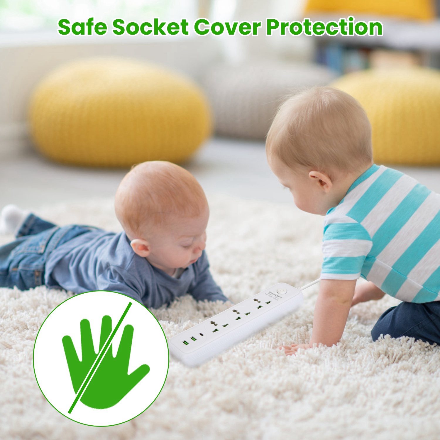 *Safe Socket Cover Protection*:The safety protection cover is designed to automatically open when the plug is inserted and close when it's removed,effectively preventing children from inserting their fingers or metal objects into the socket and causing accidents. Additionally,sturdy and impact-resistant material ensures long-term stable operation of this USB power strip.